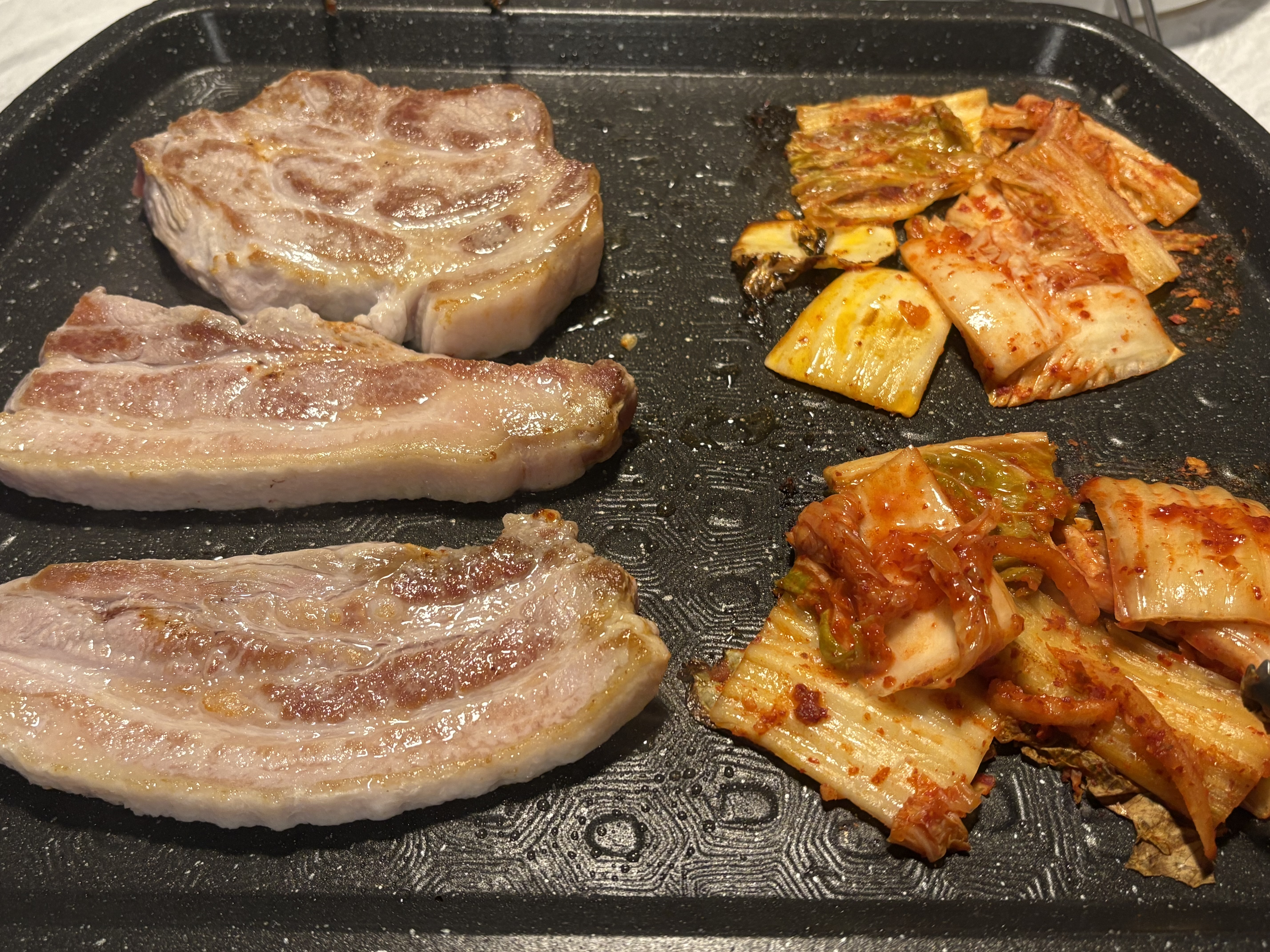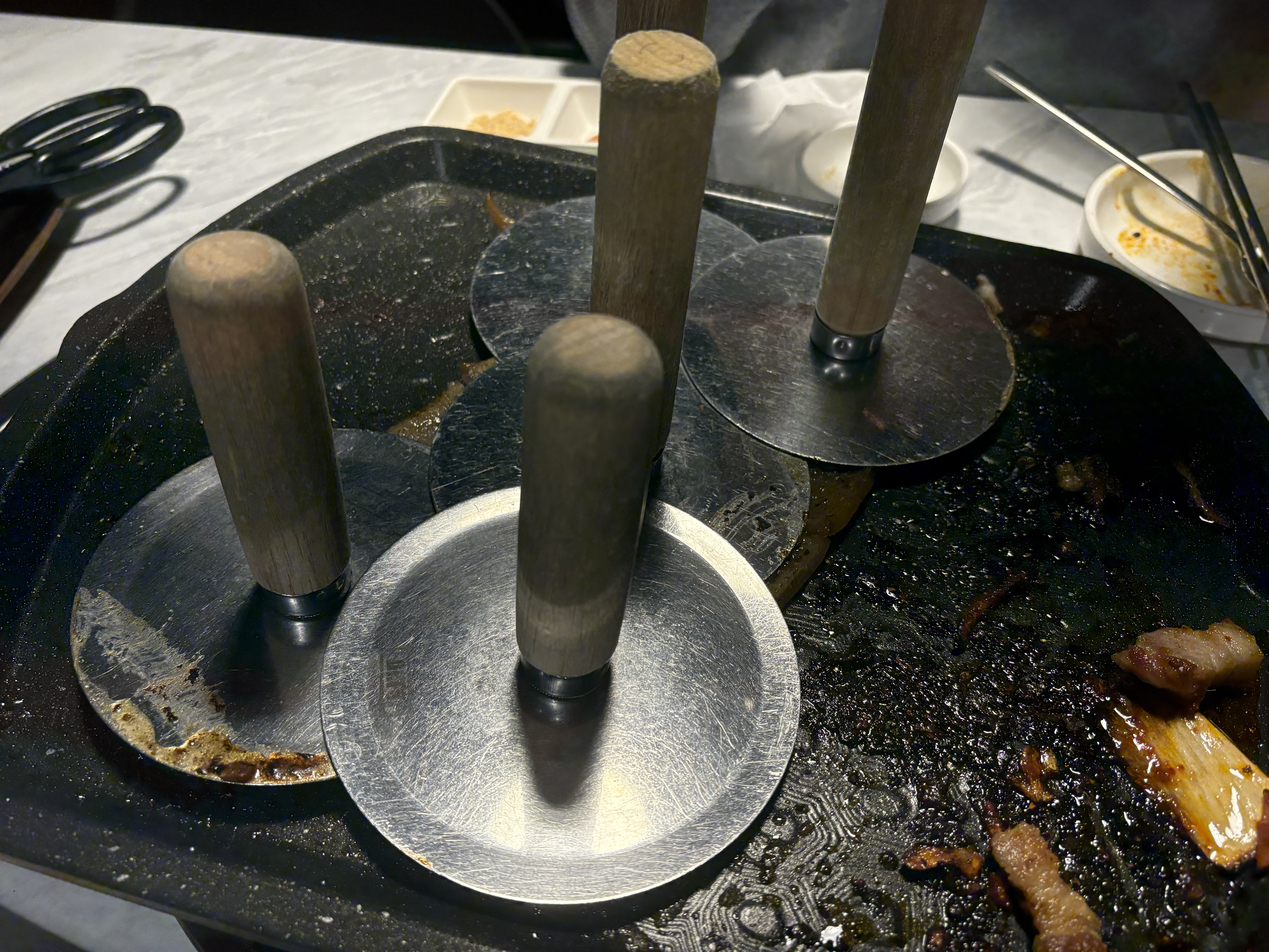 삼겹살과 목살, 거기에 공깃밥까지 한 그릇 비우고 돼지껍데기를 하나 시켜서 먹었다(마포 껍데기집이라는 이름에서 알 수 있듯이 이 곳은 돼지 껍데기가 메인이다.. 아마도). 깜빡하고 돼지 껍데기를 반대쪽부터 구워서 지나치게 말리자 조금 당황하신 사장님이 돼지 껍데기를 펴주는 도구.. (정확한 이름이 뭘까)를 다섯 개나 가져다주셨다. 덕분에 돼지 껍데기까지 맛있게 먹고 다음에 또 와야겠다는 생각을 하며 집으로 돌아왔다.