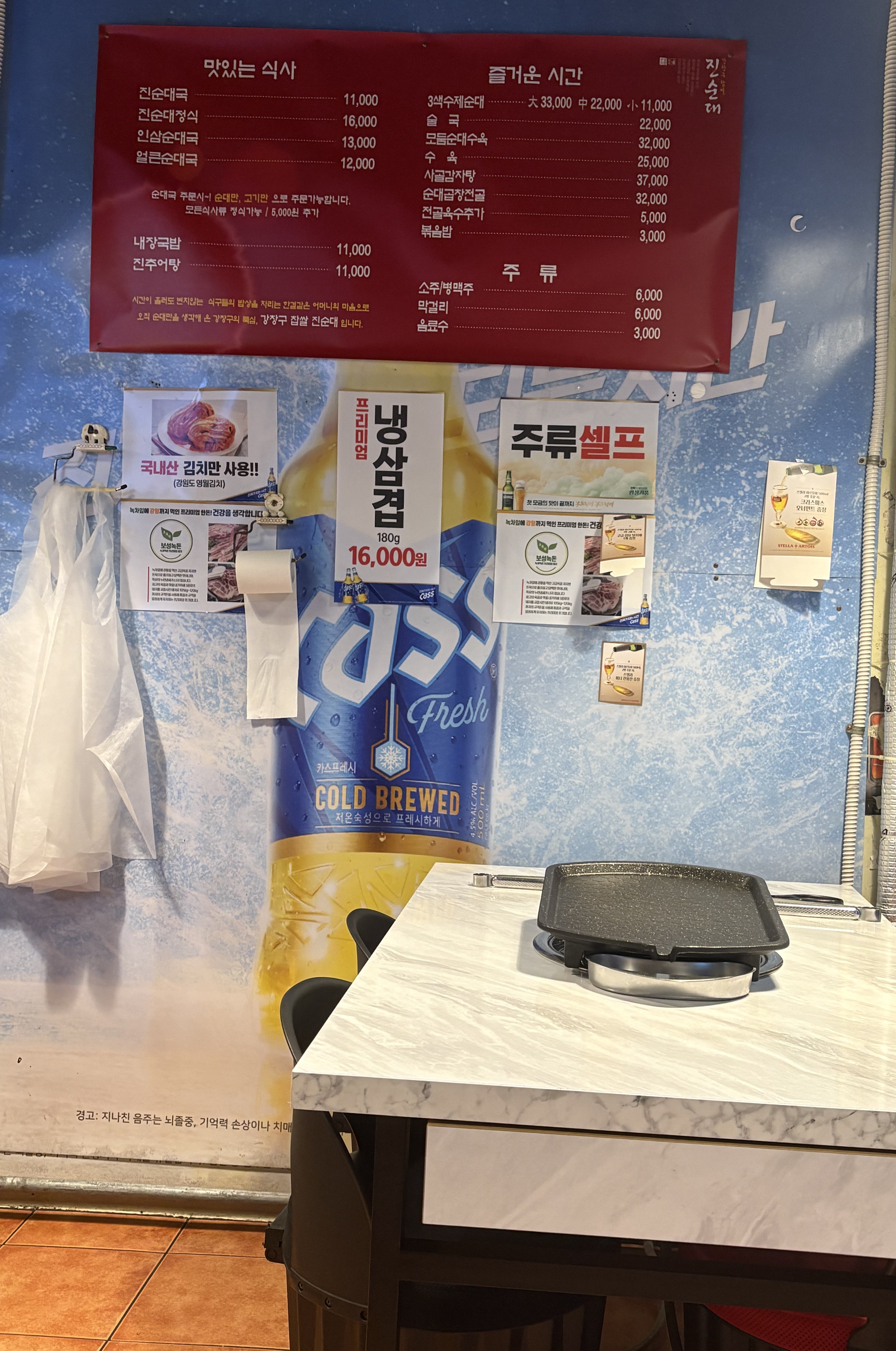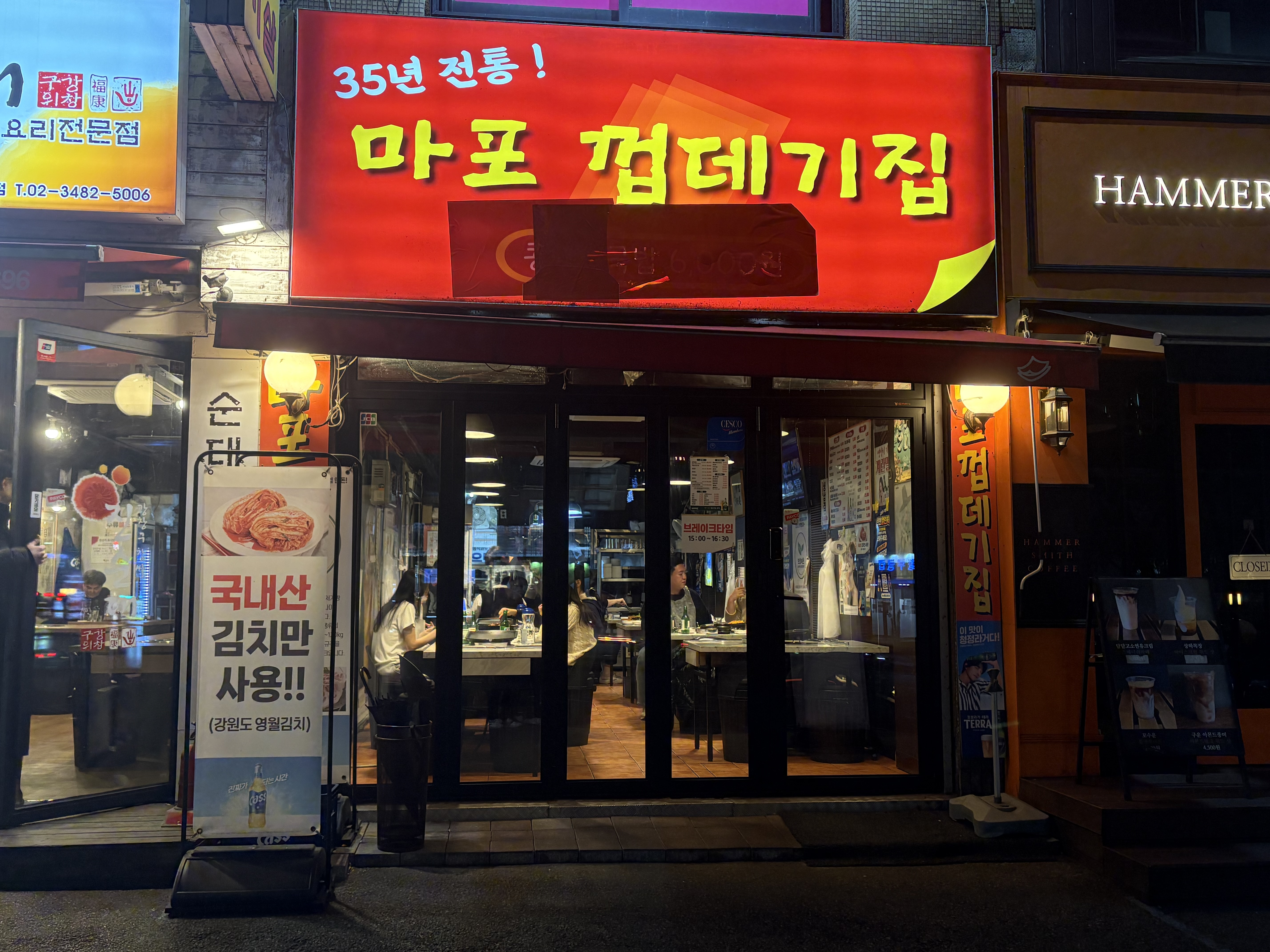 바로 왼쪽에 있는 집이 순대국밥 집 간판을 달고 있는데 안으로 들어가면 내부는 마포껍데기집과 연결이 되어있다. 즉 한 가게가 두 간판을 사용하고 있다. 처음에는 조금 혼란스러웠지만 지금은 헷갈리지 않는다(처음에는 들어갔다가 잘못 들어온 줄 알고 다시 나오려고 했다). 우리는 돼지고기와 껍데기를 먹으러 왔기에 바로 삼겹살 하나, 목살 하나를 주문하였다.