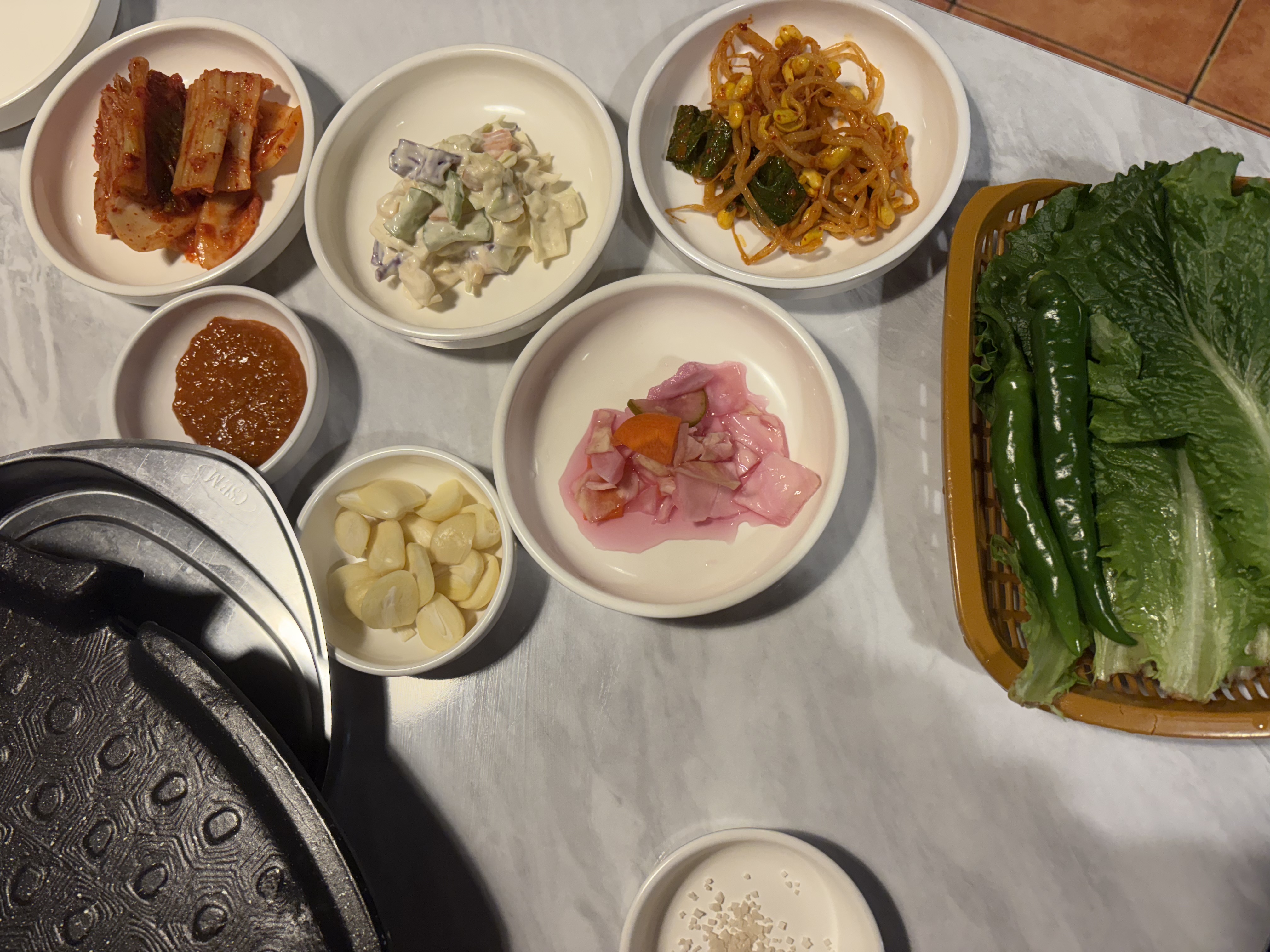 밑반찬이 다양하지는 않지만 항상 쌈을 싸 먹는 나로서는 야채가 무제한인 것으로 이미 충분하다. 요즘 야채 가격이 너무 올라서 말이지. 고기를 구워주시지는 않기에 김치와 마늘을 같이 올려서 열심히 구웠다. 고기를 파는 곳이니 고기가 맛있어야 하는 것은 당연한 것이니 굳이 장점으로 소개하지는 않겠다. 맛을 제외한 마포 껍데기집의 다른 장점은 김치가 맛있다는 것과 사람이 바글바글하지 않다는 것이다. 사실 강남역에는 정말 많은 고깃집이 있다. 하지만 한참 대기해야 하는 경우가 많고 들어간 후 고기를 먹으면 맛도 그냥저냥이다. 유명한 집도 그럴 때가 있다. 하지만 마포껍데기집은 강남 중심에서는 약간 떨어져 있어서 그런지 사람도 적당하고(없다는 것은 아니다) 대화를 하기에도 큰 불편이 없다.