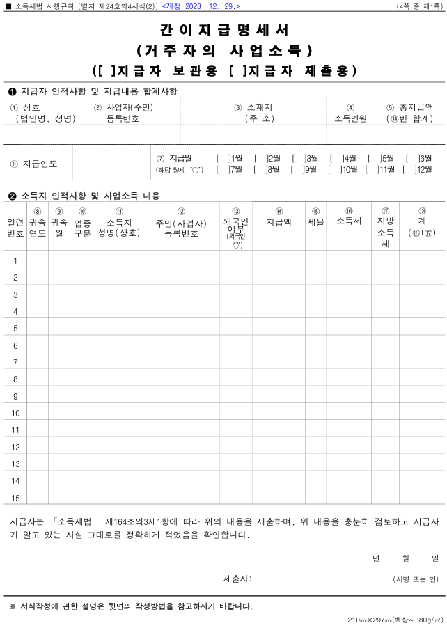 - 「소득세법」제14조 제3항 제2호에 따른 일용근로자(예: 식당주방보조원, 시간제 편의점근무자, 건설노동자 등)에게 지급한 소득에 대해서는 이 서식을 작성하지 않고 일용근로소득지급명세서를 작성합니다.