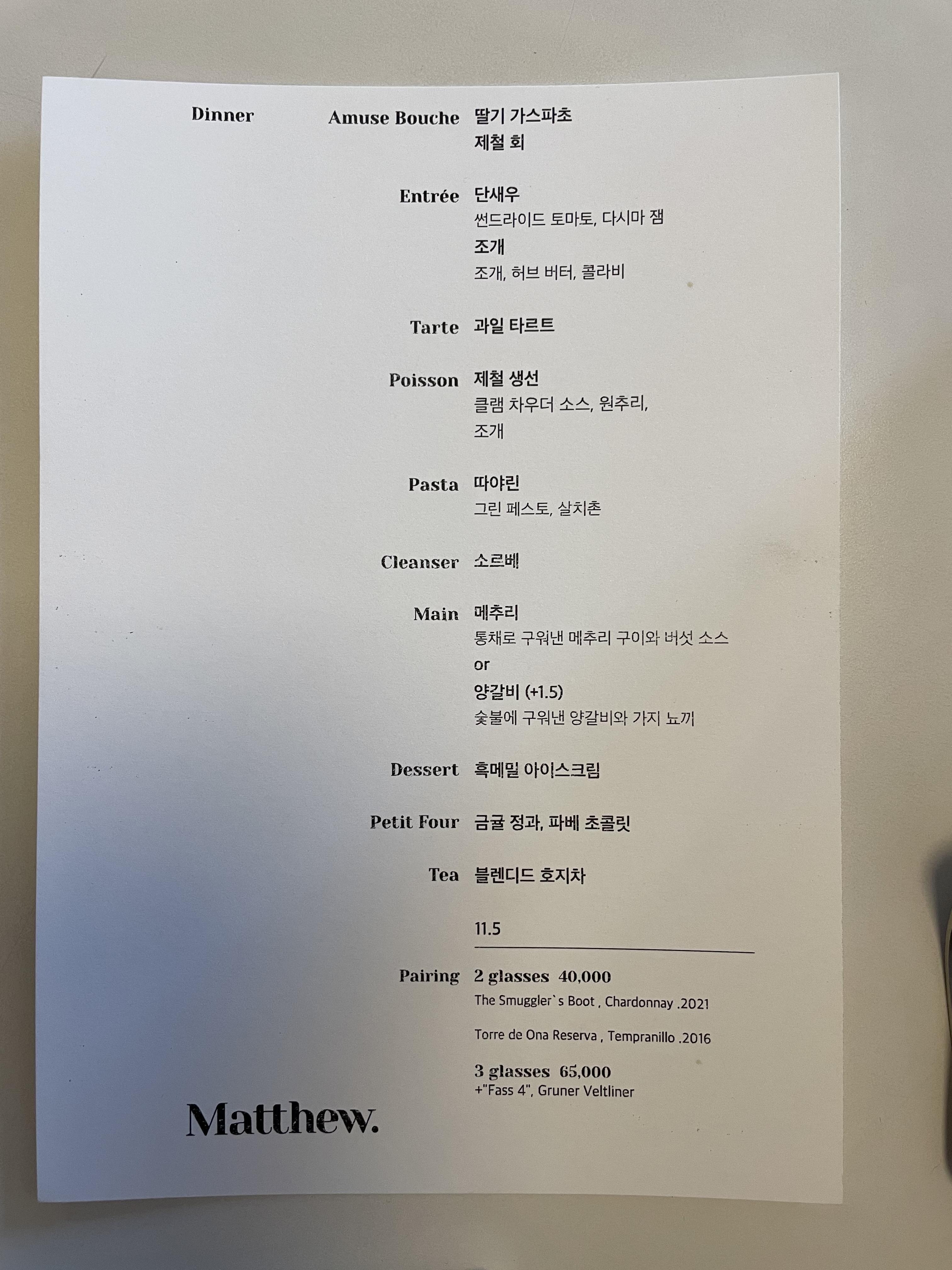 Dinner 기준으로 1인당 115,000원이다. 최근에 "모수"라는 코스요릿집을 가고 싶어서 예약을 알아보다 너무 예약이 힘들고, 가격도 비싸서 코스요리는 아무나 먹을 수 없는 건가라는 생각을 했었는데 여기는 비교적 예약도 쉽고 단짝과 1주년을 보내기에 적당한 가격으로 느껴졌다. 많은 코스요릿집을 경험해 본 건 아니지만 매튜는 음식이 나올 때마다 음식에 대한 설명도 친절하게 해 주셨고, 식기도 매번 교체해 주시고 세심하게 신경 써주셔서 너무 좋았다. 모든 음식이 너무 맛있었기 때문에 23만 원이 아깝지 않은 식당이었고, 연인과의 기념일이나 부모님을 모시고 오면 너무 만족도 있는 식당이 될 것 같다.