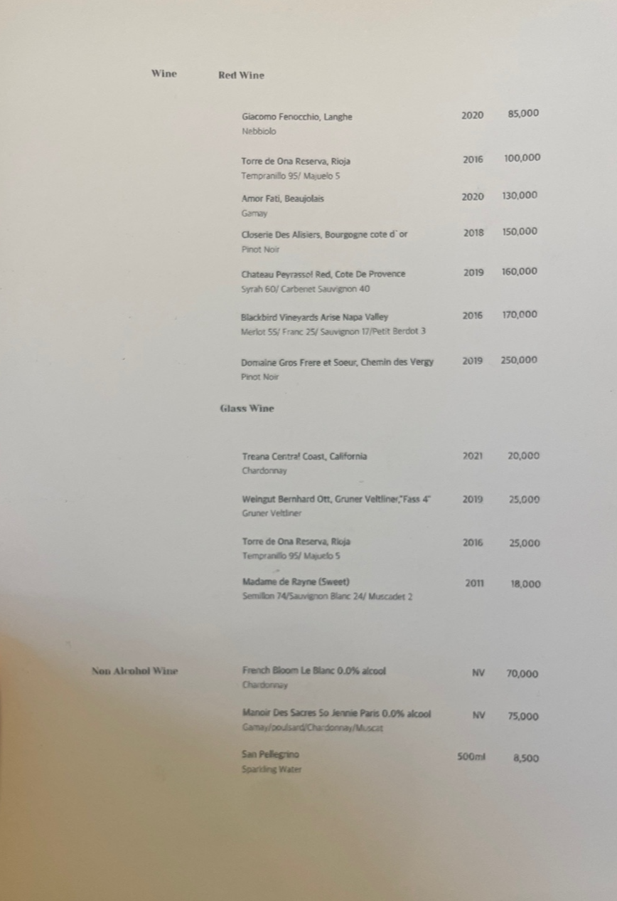 Dinner 기준으로 1인당 115,000원이다. 최근에 "모수"라는 코스요릿집을 가고 싶어서 예약을 알아보다 너무 예약이 힘들고, 가격도 비싸서 코스요리는 아무나 먹을 수 없는 건가라는 생각을 했었는데 여기는 비교적 예약도 쉽고 단짝과 1주년을 보내기에 적당한 가격으로 느껴졌다. 많은 코스요릿집을 경험해 본 건 아니지만 매튜는 음식이 나올 때마다 음식에 대한 설명도 친절하게 해 주셨고, 식기도 매번 교체해 주시고 세심하게 신경 써주셔서 너무 좋았다. 모든 음식이 너무 맛있었기 때문에 23만 원이 아깝지 않은 식당이었고, 연인과의 기념일이나 부모님을 모시고 오면 너무 만족도 있는 식당이 될 것 같다.