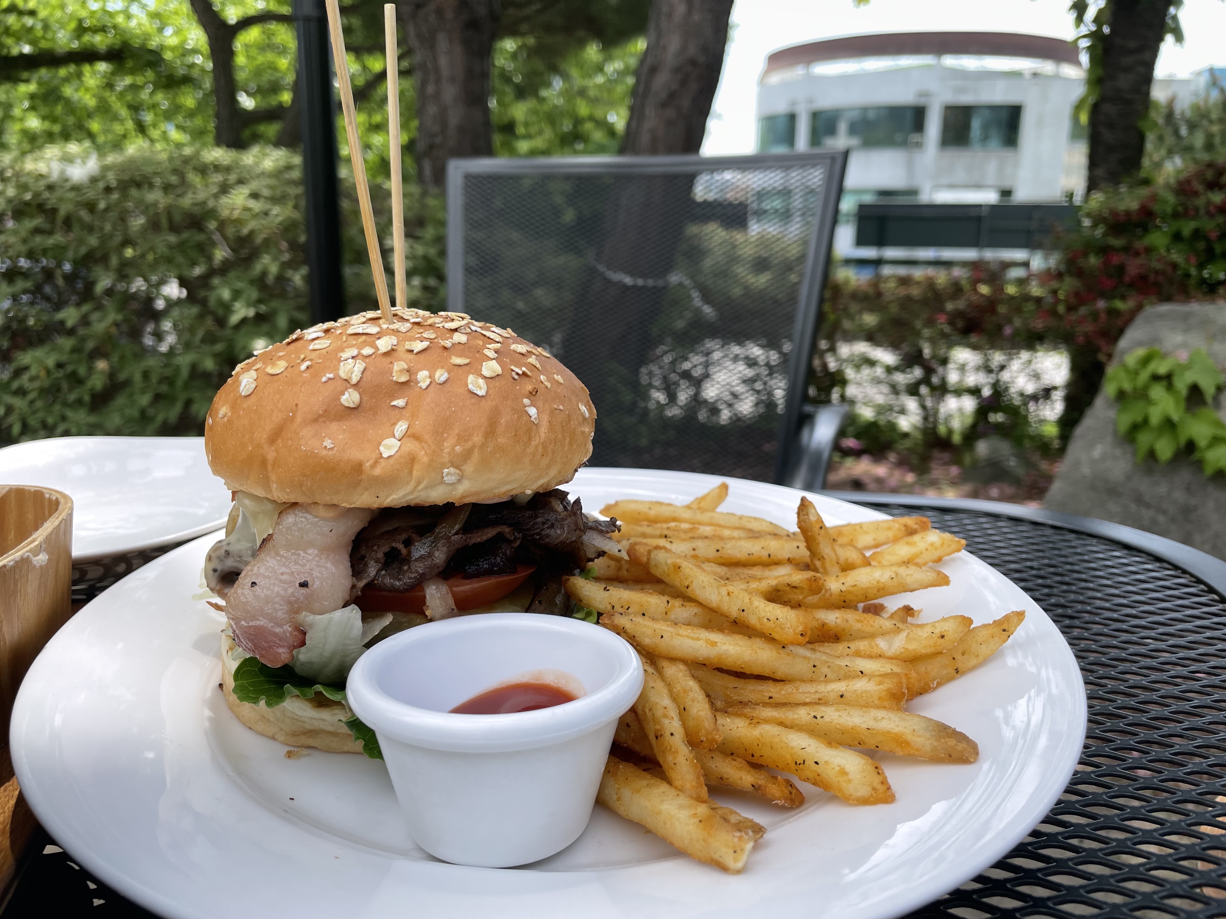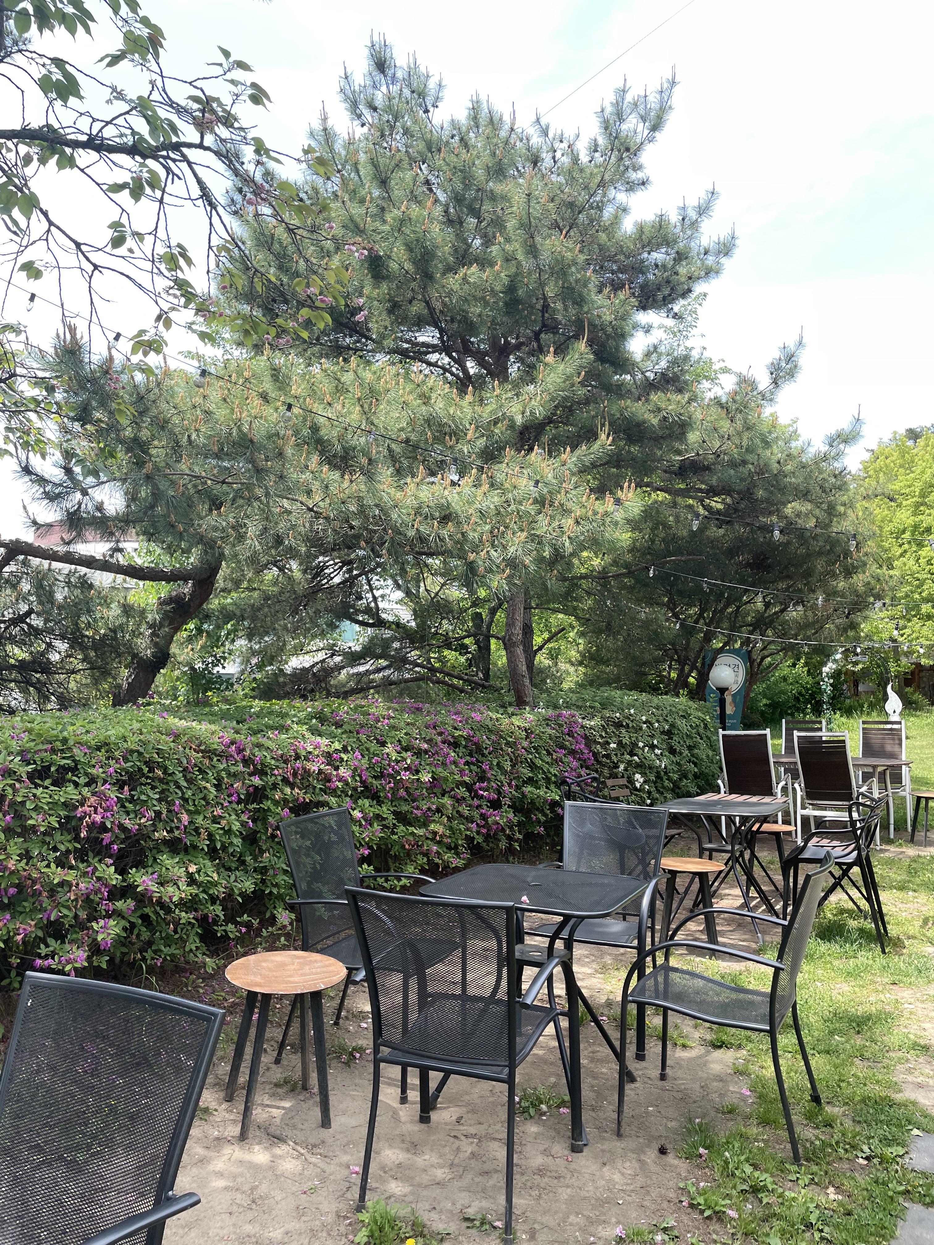 날씨가 화창하기도 해서 우리는 야외테이블에서 먹었는데 야외테이블 뒤쪽으로는 간단히 반려견이 뛰어놀 수 있는 파릇파릇한 공간이 있었다. 야외 테이블 바로 앞에는 깔끔한 화이트톤의 인테리어에 계단 사이로 가드닝을 잘해놓으셔서 동화 속 같은 느낌이 든다. 가게이름과 분위기가 일치하는 곳이 아닐까 싶다.