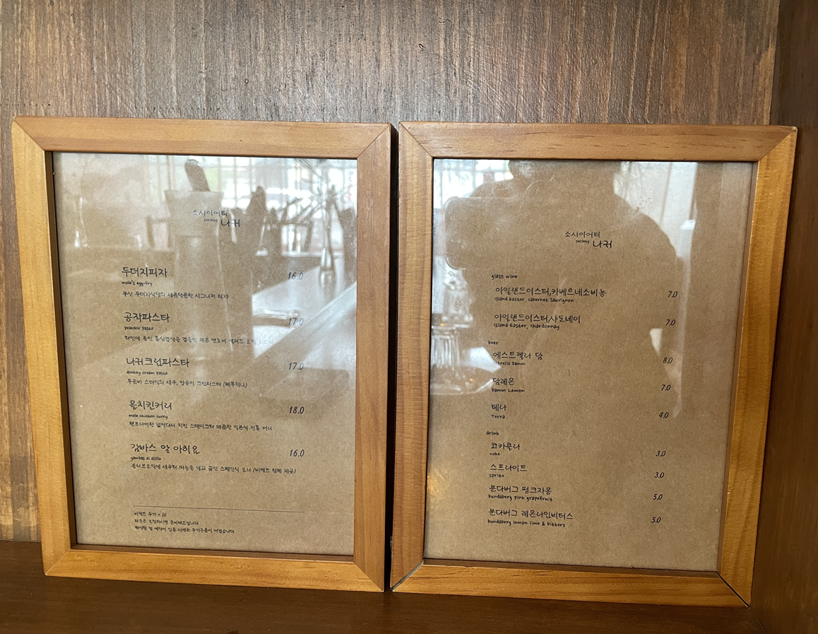 메뉴가 다양하지 않습니다. 저의 경우 이것저것 많아서 뭘 먹어야 할지 고민하는걸 별로 안 좋아하여서 메뉴의 종류는 적당하다고 생각합니다. 두 명이 방문하면 두세 개의 메뉴를 시킨다고 합니다. 음식의 양이 많지 않기에 세 개를 시켜도 충분히 먹을 수 있을 것 같습니다. 다만 저와 제 친구는 이런 정보를 몰랐기에 두더지피자와 나귀크림파스타만 주문했습니다. 음식 나오는 속도는 빠르지도 느리지도 않았습니다.