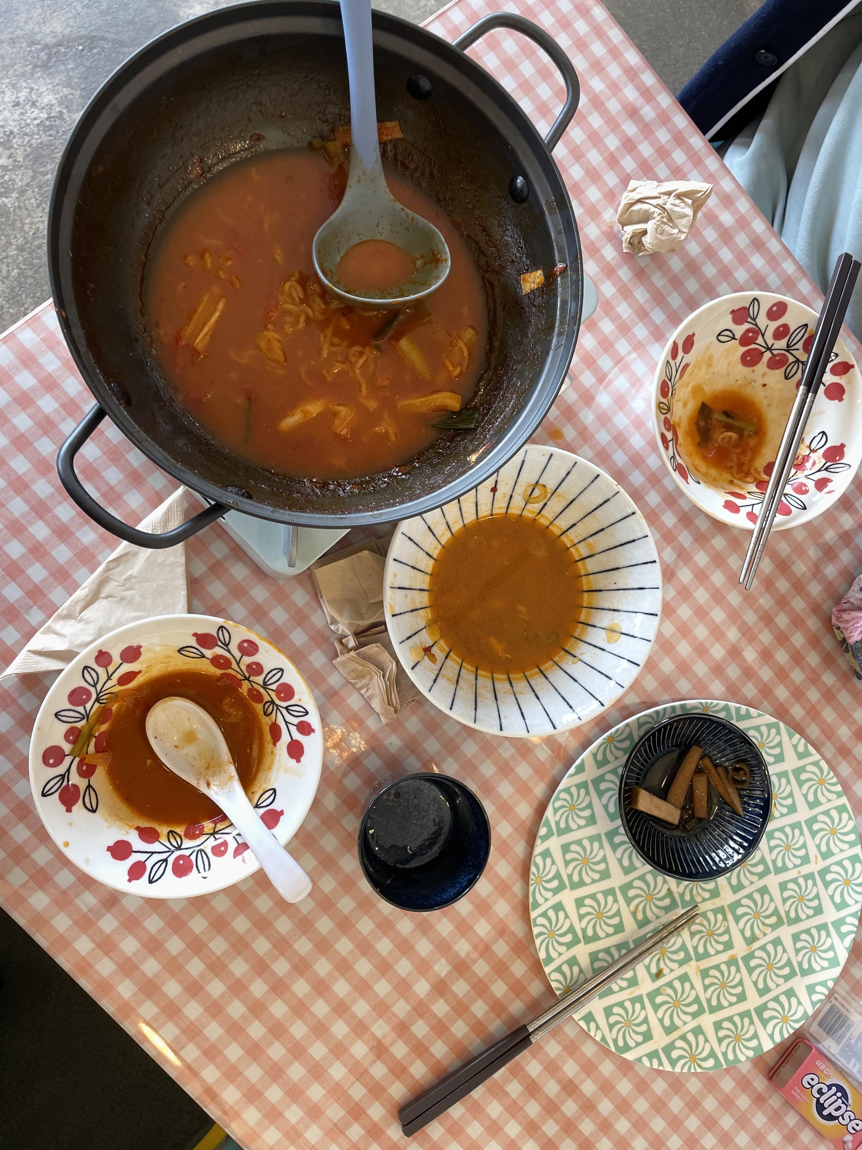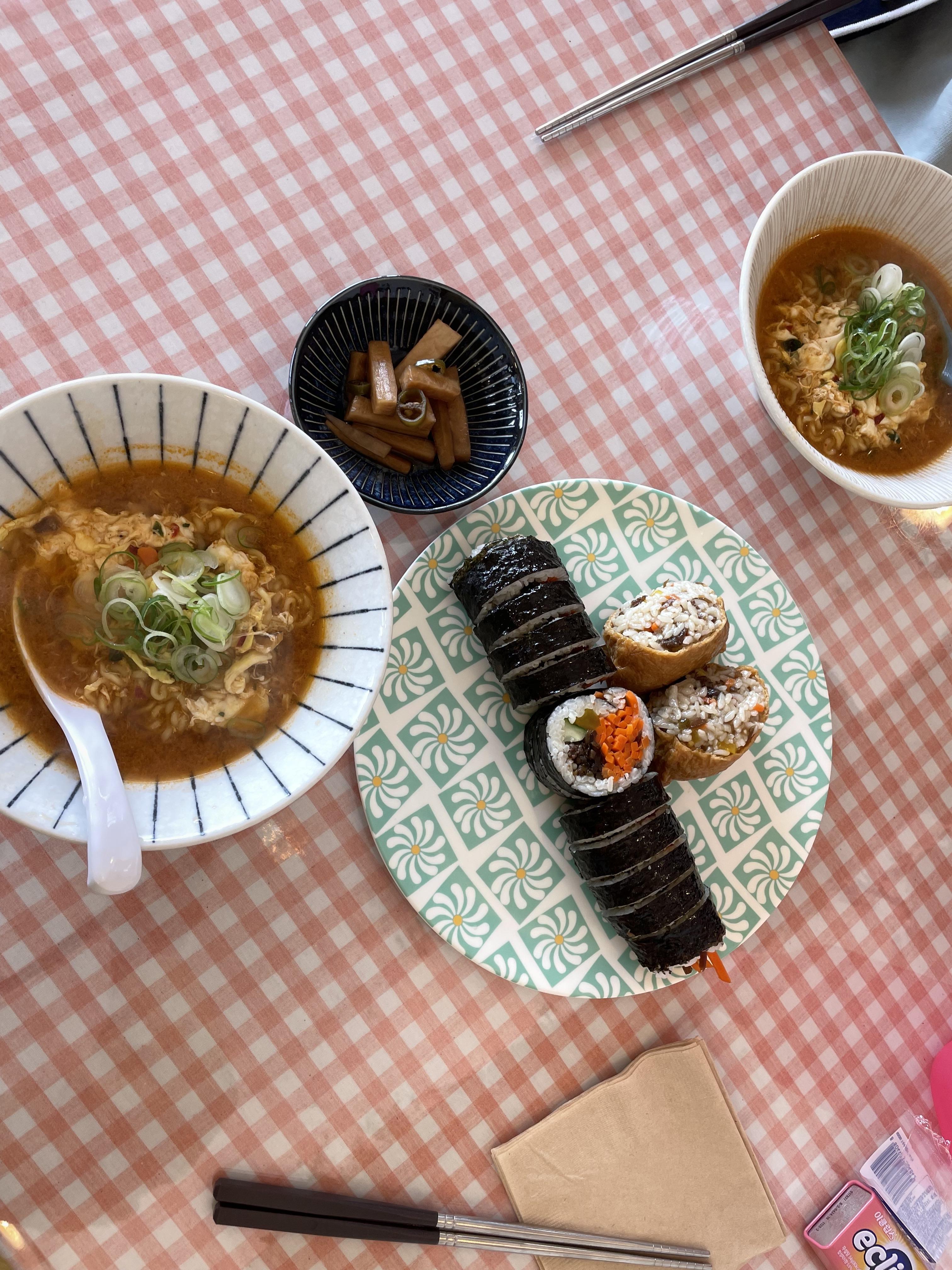 처음에는 라면과 김밥이면 충분할 거라고 생각해서 두 개만 시켰는데 중간에 먹다가 나의 먹부림 능력을 너무 과소평가했다는 것을 깨달았다. 그래서 급히 라볶이도 추가로 시켰다. 접시가 너무 귀엽고 테이블보랑 너무 잘 어울린다. 버너사진이 없는데 버너도 진짜 귀여웠다. 딱 자취방 느낌이다.