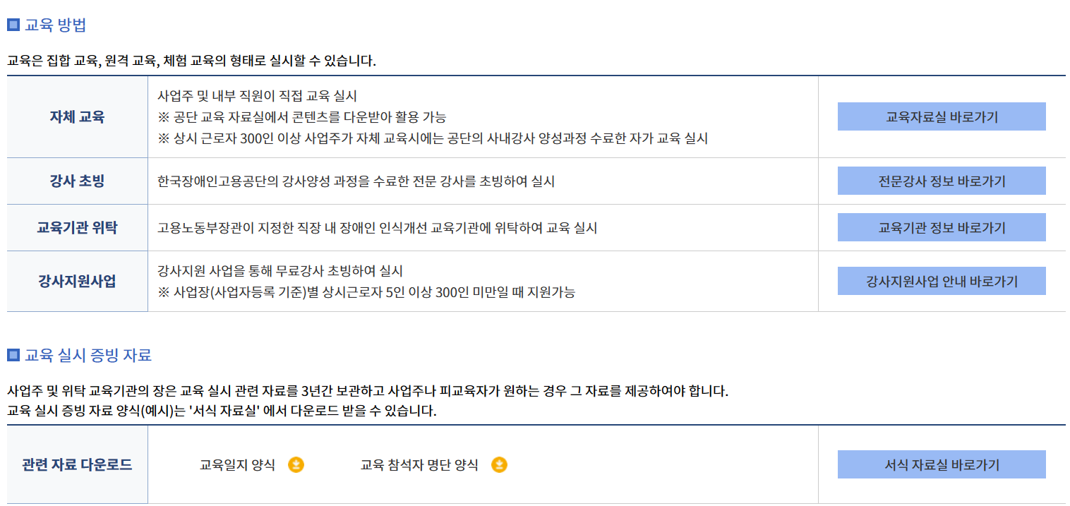 다음으로는 직장 내 장애인 인식 개선교육이다. 장애인고용촉진 및 직업재활법에 따르면 장애인인식개선교육도 매년 받을 의무가 있다. 교육방법은 직장 내 장애인인식개선 교육포털에 자세히 나와있다.