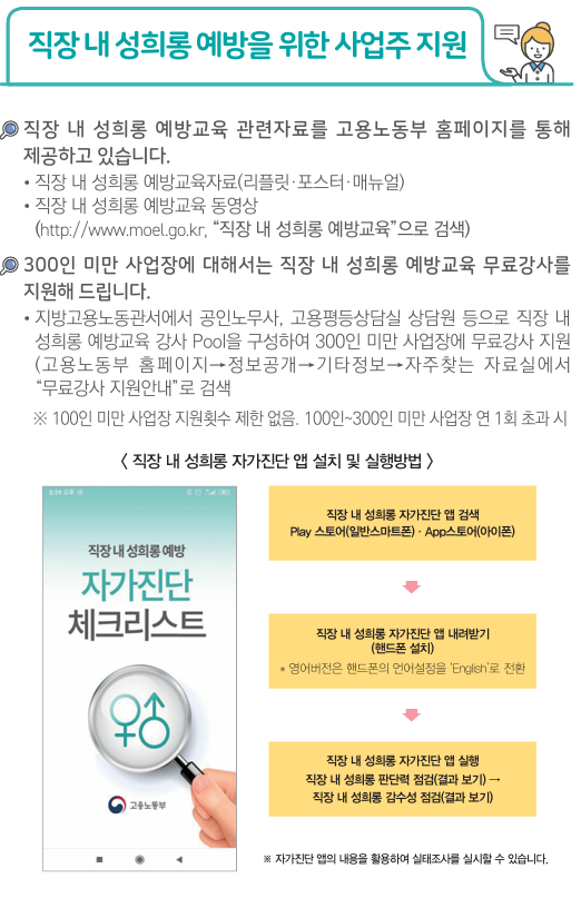 출처: 고용노동부 직장 내 성희롱 예방 교육 자료(리플릿) / 직장내 성희롱 예방을 위한 사업주 지원