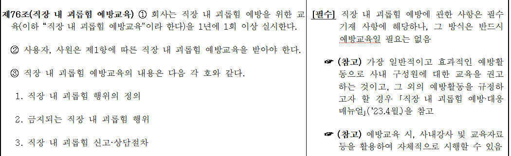출처: 고용노동부 2023년 표준취업규칙(게시) 중 직장 내 괴롭힘 예방교육 관련