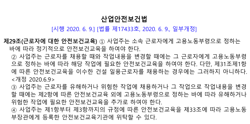 특히나 '24년부터는 산업안전보건교육이 개정되어 사무직 종사자도 상하반기 6시간 이상 이수해야 하는 규칙이 생겼다. 우리 회사는 all 사무직에 모두 노트북만 두드리는 회사원들인데 안전교육 듣다 보면 직무랑 상관없는 공사, 전기, 제조업 교육 등등 실효성 없는 내용이 너무 많아서 형식적이라는 생각이 너무 많이 든다.