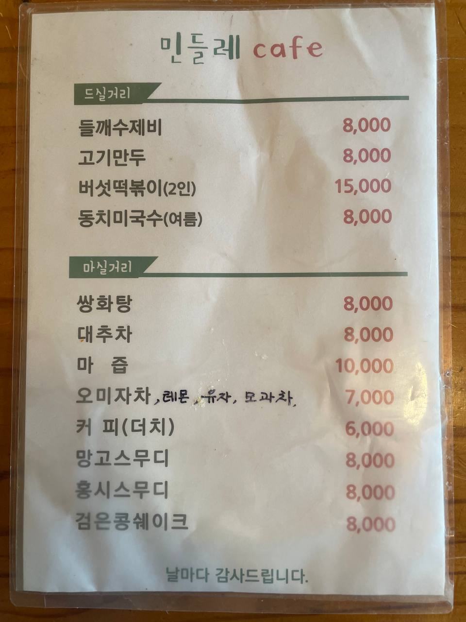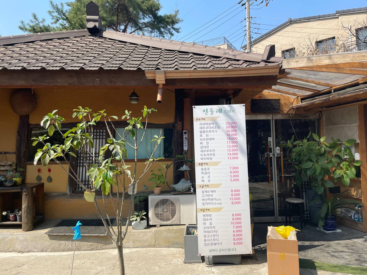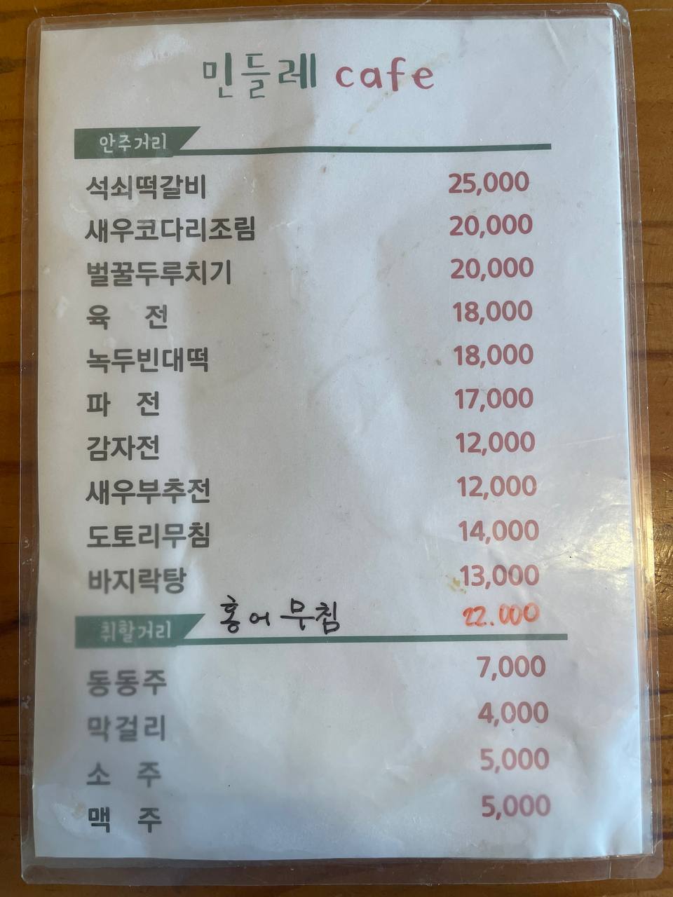 간판은 민들레 cafe라고 되어있지만, 여러가지 먹거리도 팔고 있다. 그리고 메뉴가 모두 술안주 느낌이라 음식을 선택하고 나면 자연스럽게 술에 눈이 가게 된다.
