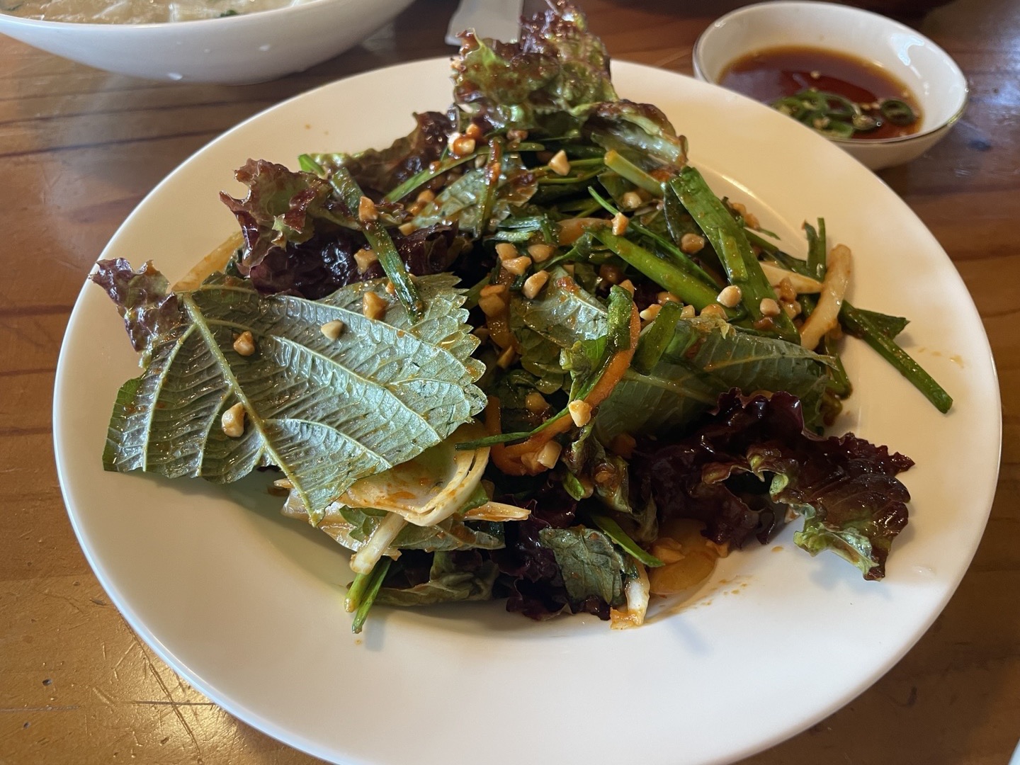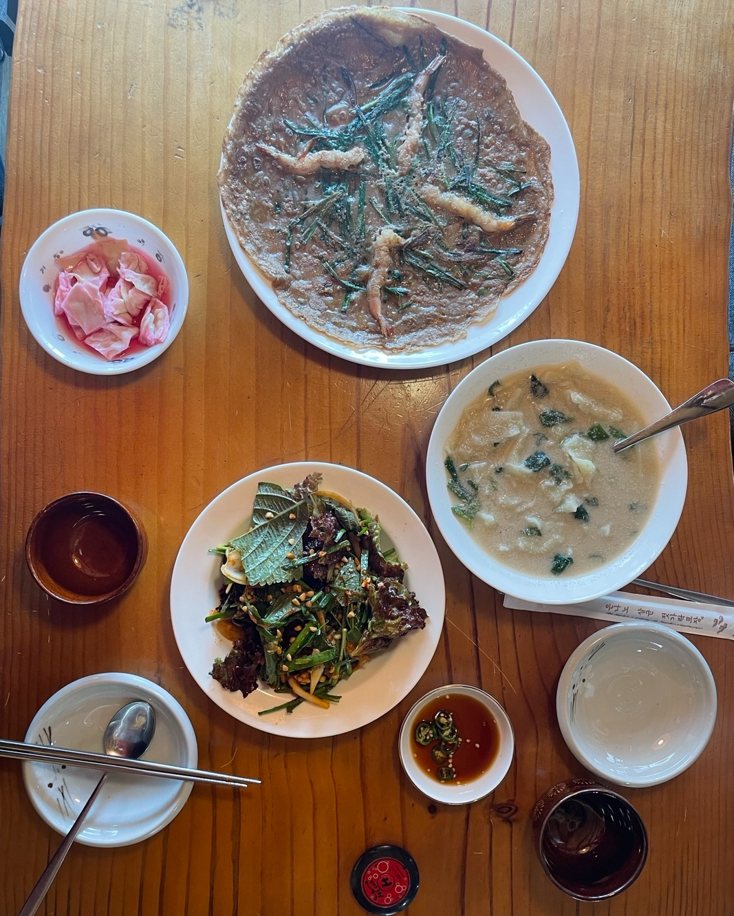 사장님의 음식솜씨가 너무 좋으신 것 같다. 들깨수제비도 들깨의 고소함에 자극적이지 않은 국물맛이 일품이었고, 새우 부추전도 기름지지 않고 맛있었다. 약간 도토리 베이스로 하셨는지 반죽이 쫀득하고 얇아서 남기지 않고 다 먹었다. 그리고 진짜 사이드 반찬으로 주신 상추&깻잎 샐러드가 정말 맛있었다. 배워가고 싶을 정도로... 샐러드 소스도 직접 만드시고 하시는 것 같은데 뭔가 알려주시면 집에서도 반찬거리로 해 먹고 싶은 맛이었다. 주문한 음식이 모두 맛있어서 다른 걸 더 먹어보고 싶었지만 과식은 하면 안 되니 다음에 다시 오자는 기약을 남기고 일어났다.