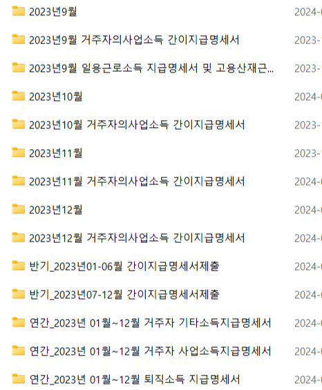 개인적으로 나는 파일을 만들어 매월 파일을 확인하면서 누락된 지급명세서가 없는지 확인하는 편이다. 매월 원천세 신고 후 원천세 신고서에 어떤 소득들이 있는지 확인하고, 원천세 신고서에 해당하는 소득이 있으면 파일을 추가로 만들어 신고할 수 있도록 관리하고 있다.
