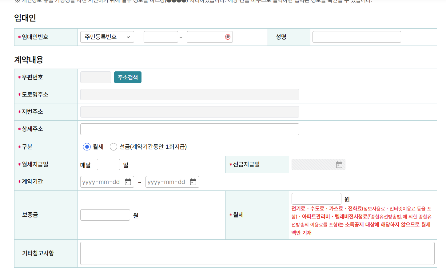 그러면 이렇게 임대인의 인적사항과 계약내용, 첨부파일을 업로드할 수 있는 것들이 나온다.