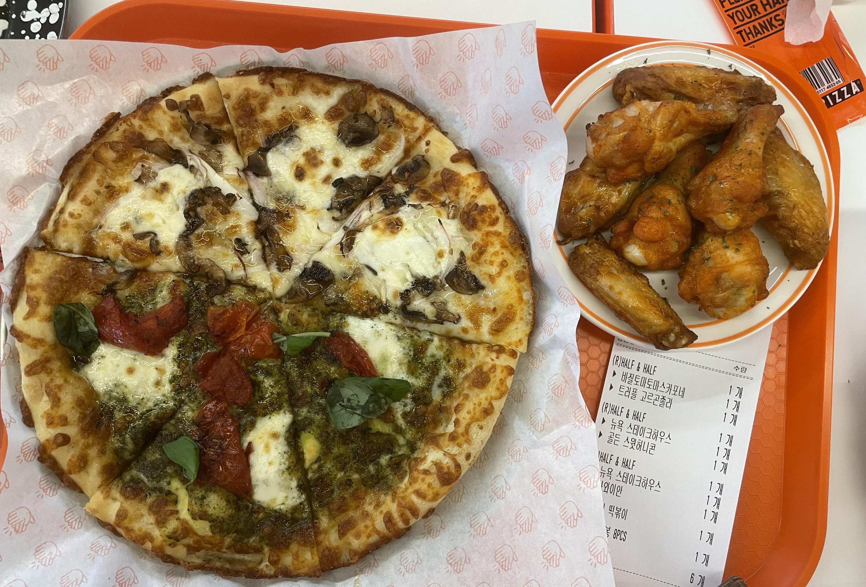 반반피자. 페퍼로니 떡볶이. 윙봉8pcs