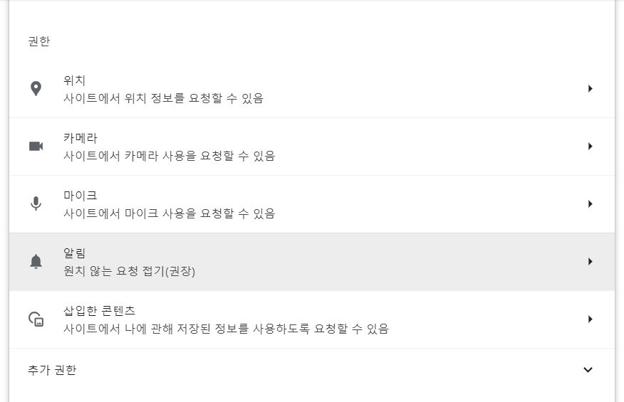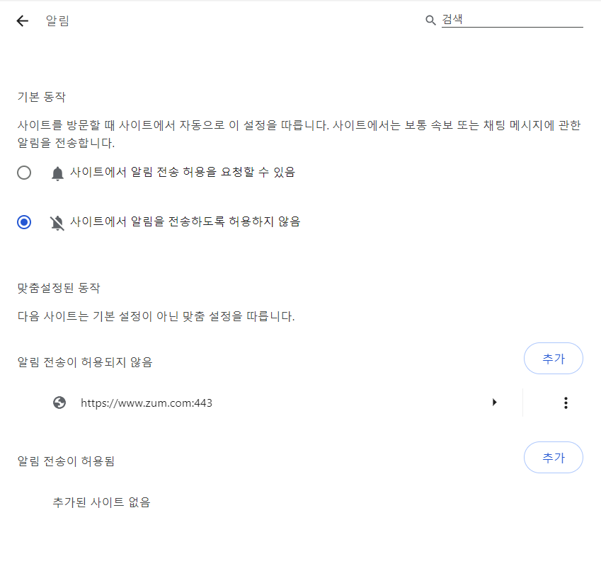 8. 사이트에서 '알림을 전송하도록 허용하지 않음' 클릭 후 알림이 필요한 사이트는아래 알림 전송이 허용됨'에서 별도로 추가하기