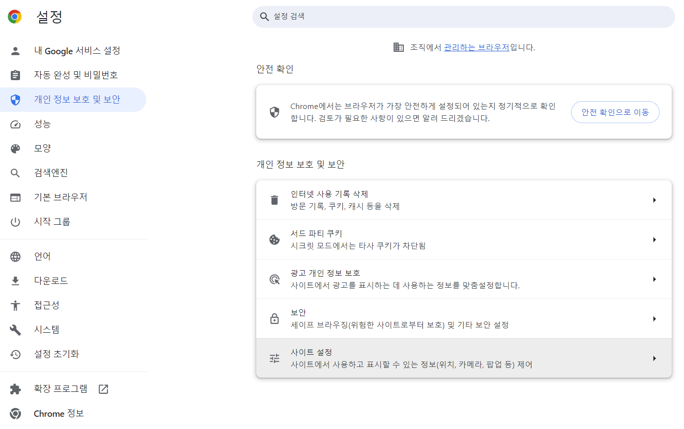 6. 개인 정보 보호 및 보안 > 사이트 설정 클릭