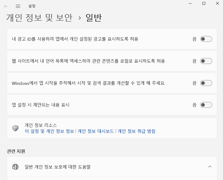 Windows에서 앱 시작을 추적해서 시작 및 검색 결과를 개선할 수 있게 해 주세요(끔)