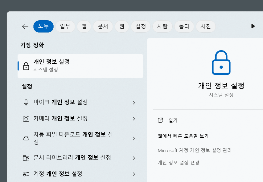 3. 다시 윈도우 검색에서 개인 정보 설정 검색