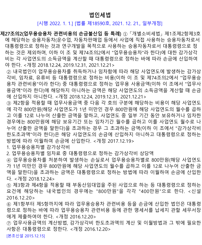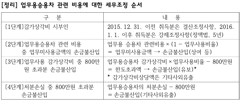 | 감가상각 의무화 (5년/정액법) | 2016.1.1. 이후 개시 사업연도에 취득하는 승용자동차부터 적용 | |