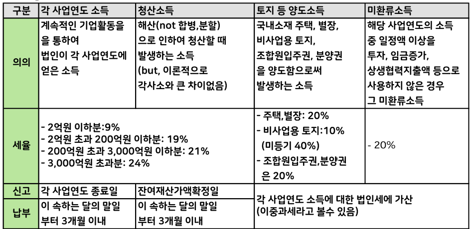각사업연도소득, 청산소득, 토지등양도소득, 미환류소득의 과세소득 범위