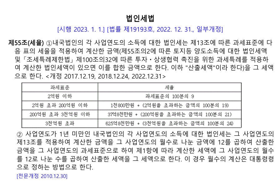 국세청>국세신고안내>법인신고안내>법인세>기본정보>세율 (nts.go.kr)