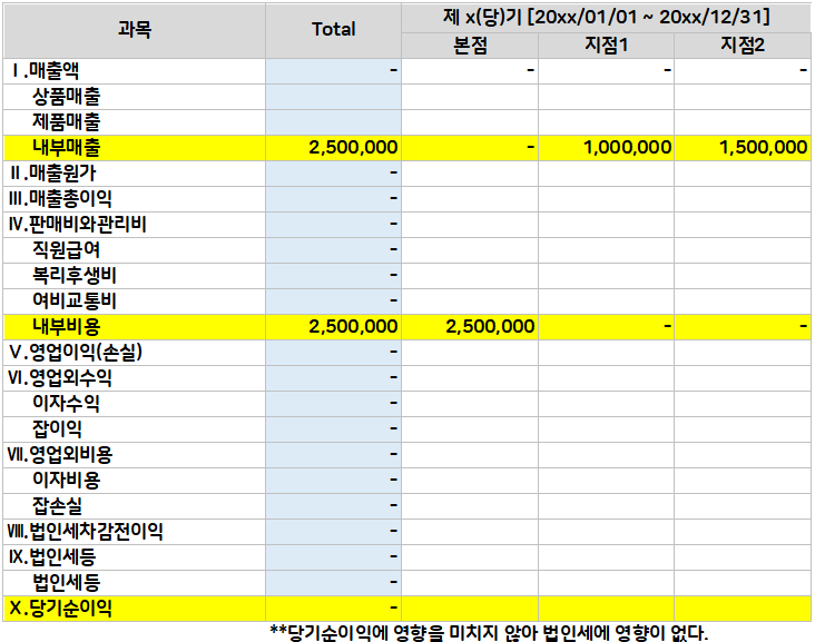 매출 계정과목 중 내부매출을 만들고, 비용 계정과목 중 내부비용을 만들어서