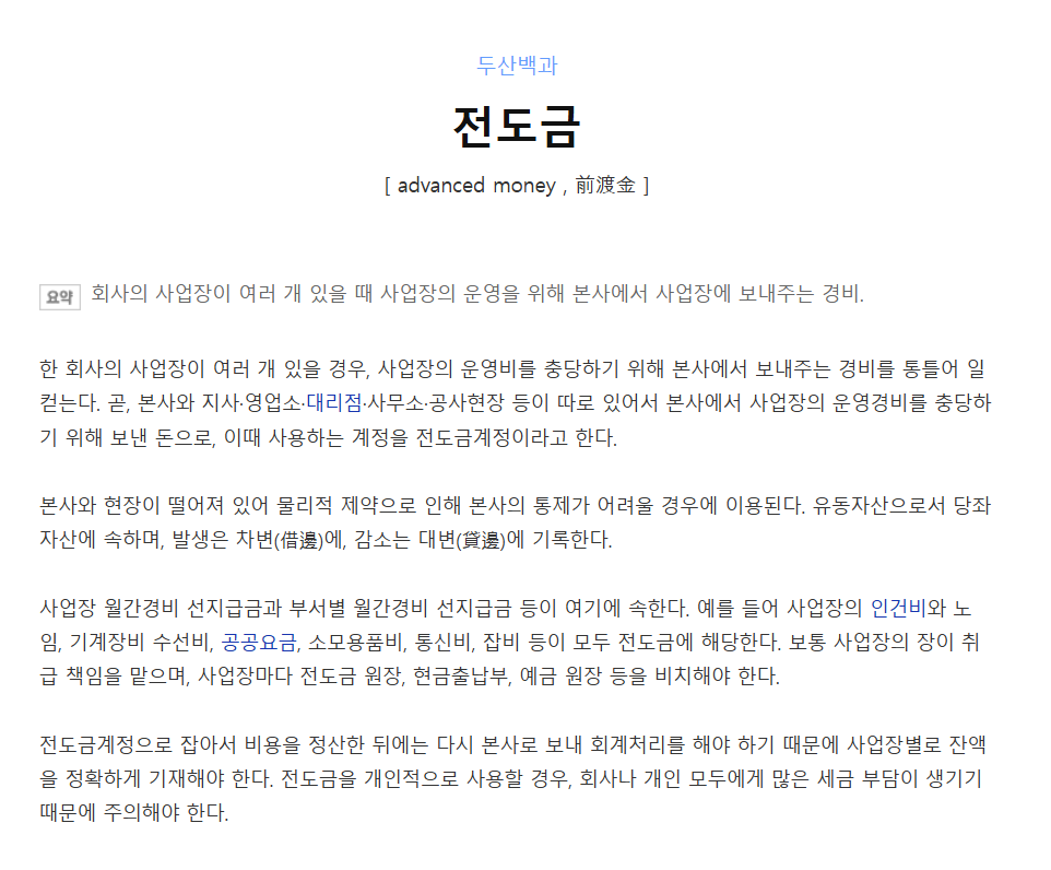 네이버 지식백과에 따르면 전도금은 한 회사에 사업장이 여러 개 있을 경우 사업장의 운영비를 충당하기 위해 본사에서 보내주는 경비를 통틀어 말한다고 한다.