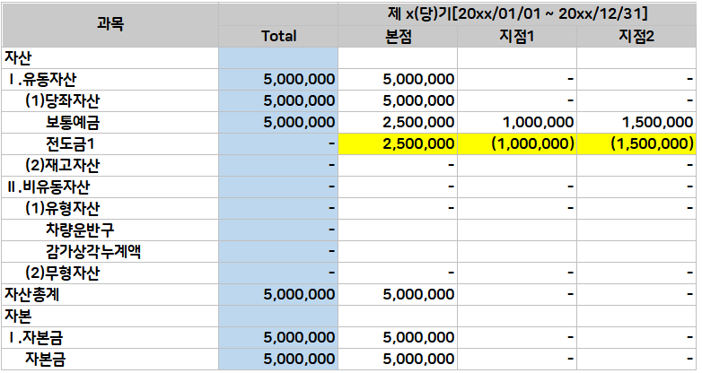 ex. 자본금이 500만원이 들어가 있는 본점에서 지점1에 100만 원 지점2에 150만 원을 송금했다고 가정했을 때