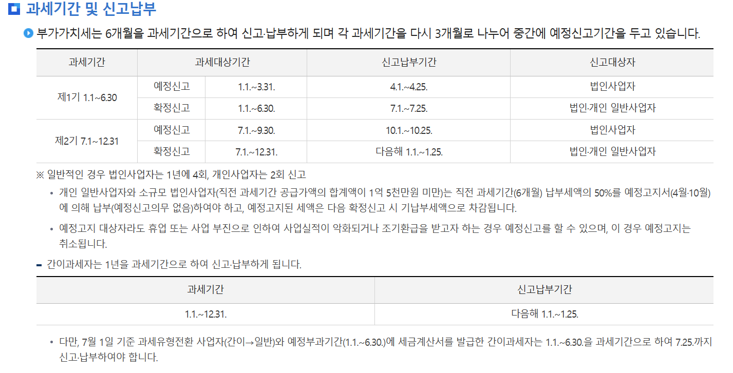 (1.1~12.31일까지의 부가세를 다음 해 1/25일까지 신고 및 납부한다.)
