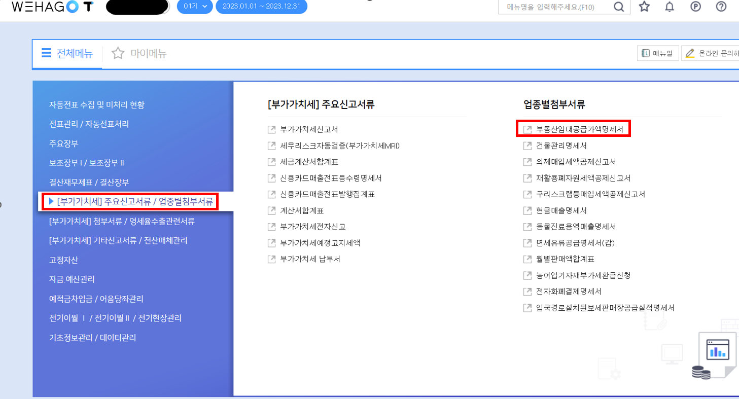 우선, 위하고 메인화면에서 부동산임대공급가액명세서를 들어간다.