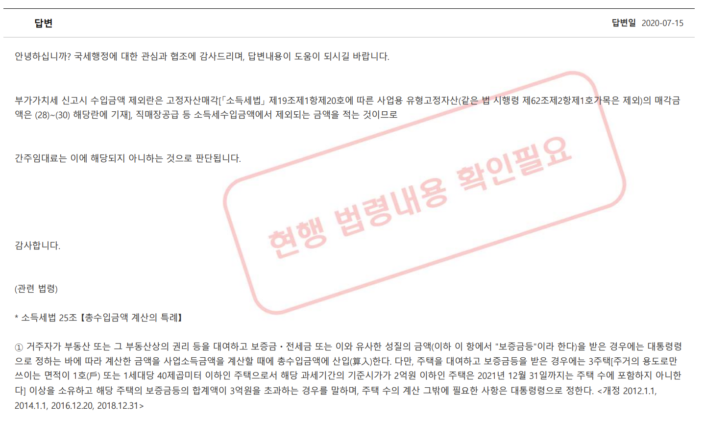 홈택스 인터넷상담내역에 부가가치세 신고 시 간주임대료가 수입금액제외에 해당하지 않는다는 답변이 있었다.