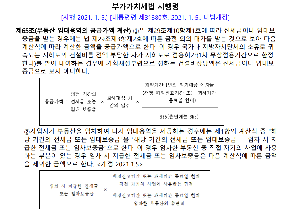 - 전세금이나 임대보증금을 받는 경우에는 법 제29조제3항제2호에따른 금전 외의 대가를 받는 것으로 보아 계산식에 따라 계산한 금액을 공급가액으로 한다.