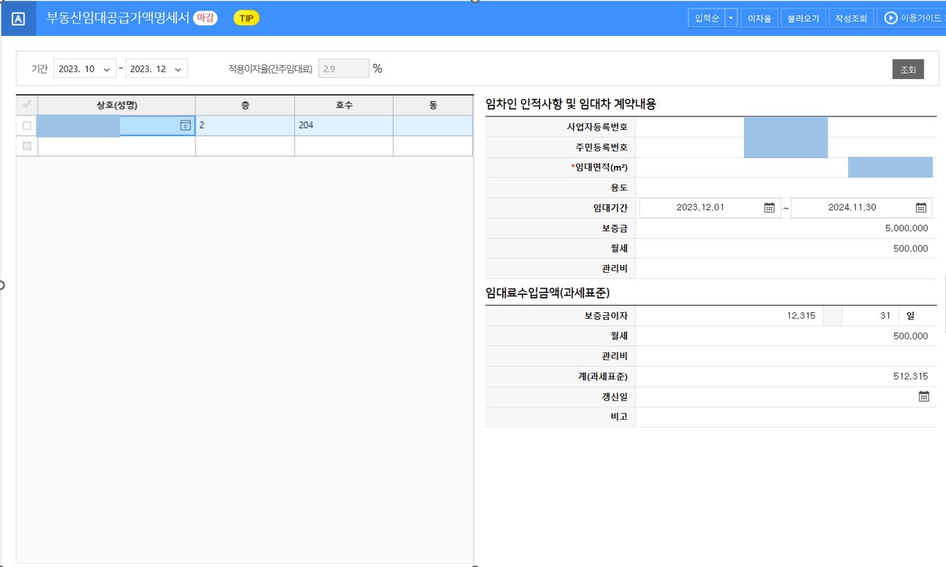 4. 임차인 인적사항 및 임대차 계약내용 기재 (사업자번호, 임대면적, 임대기간, 보증금, 월세, 관리비 등)