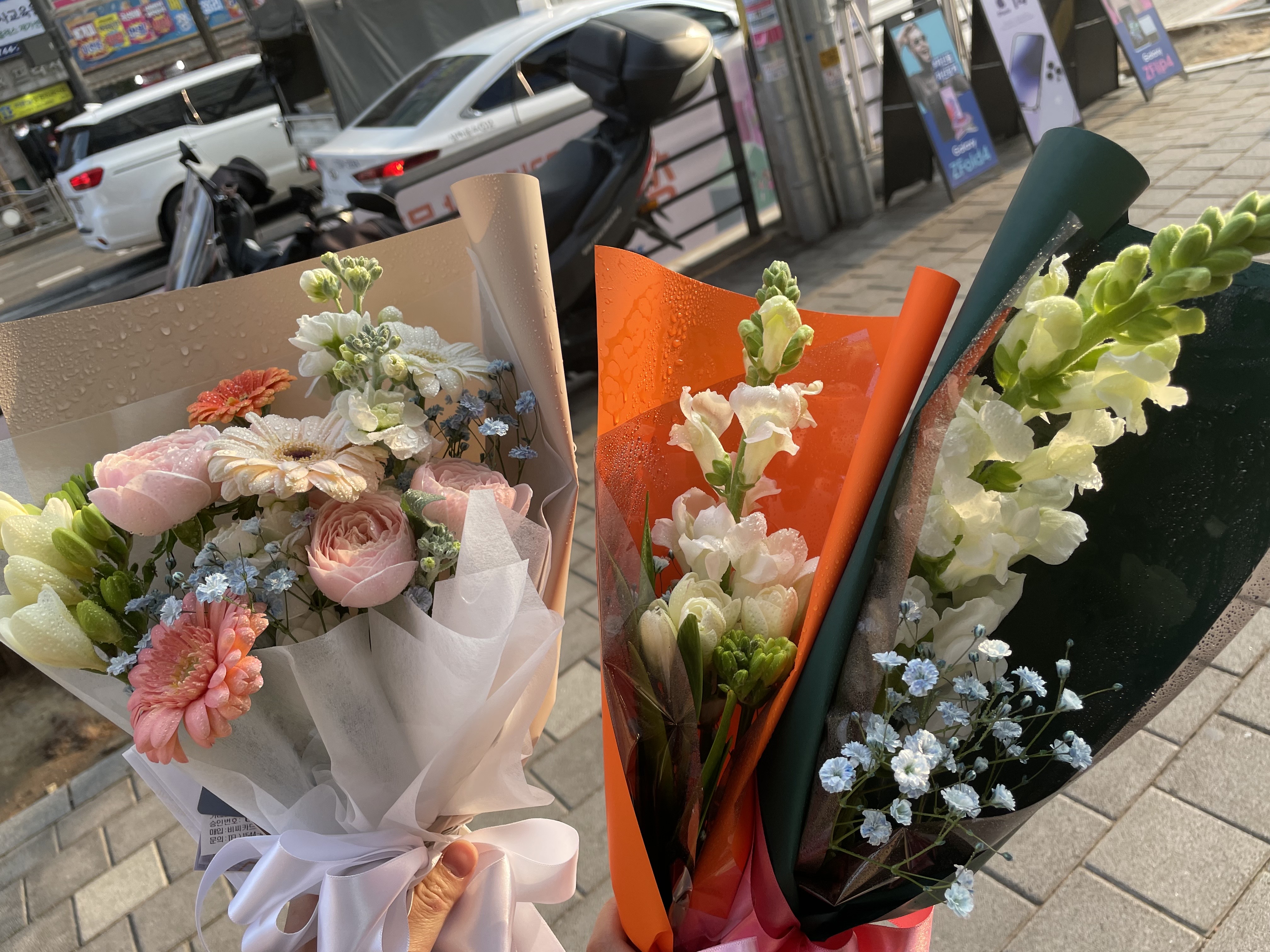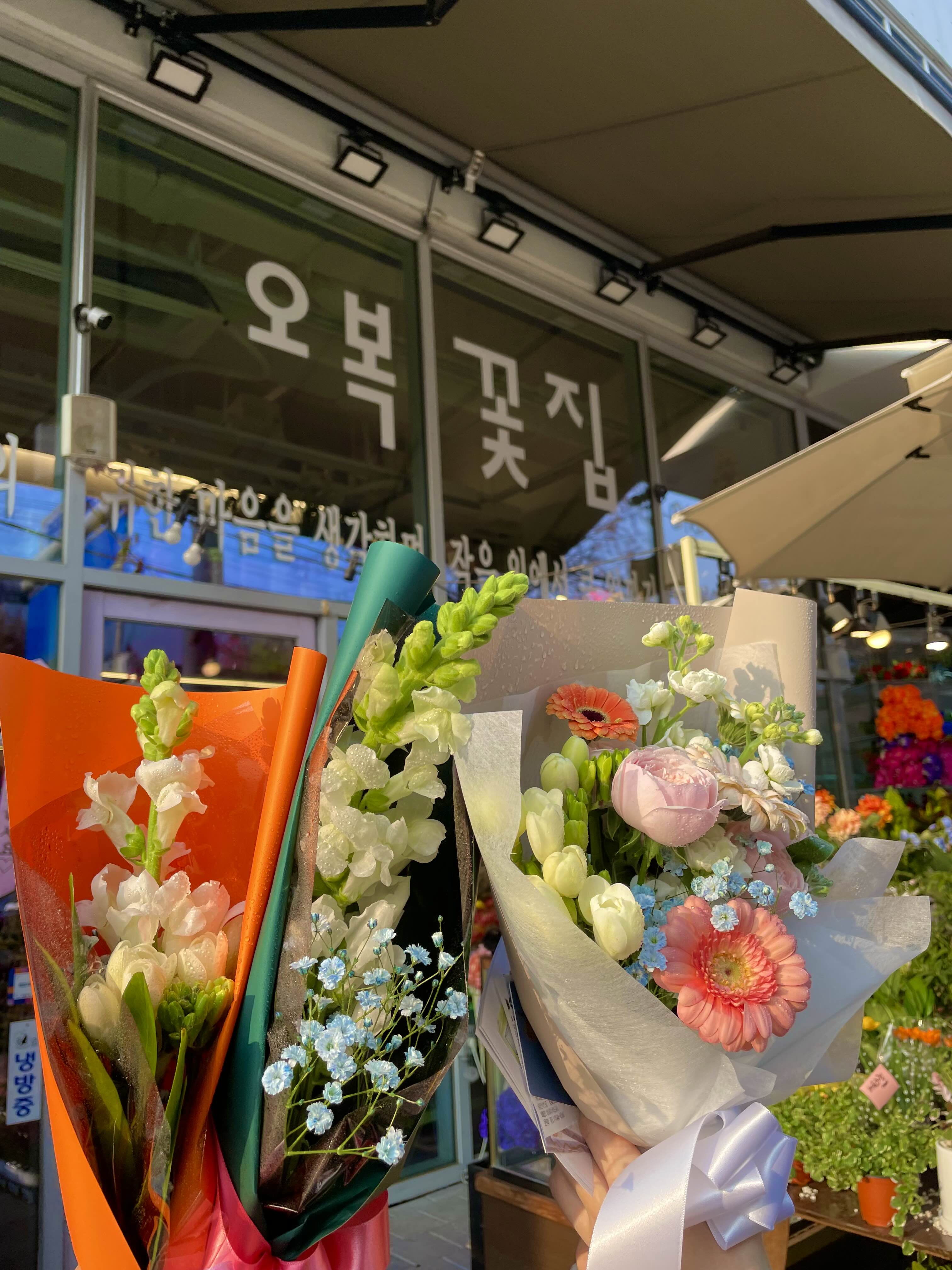 꽃 종류도 다양하고, 색감도 많고, 잘 정리되어 있어서 고르는 재미가 있었다. 그리고 관리가 잘 되어있어서 꽃다발 받을 때 간혹 상한 꽃이 있는 경우도 있는데, 오복꽃집은 싱그러운 꽃들이 가득해 꽃들의 생생한 느낌이 살아있는 게 좋았다.