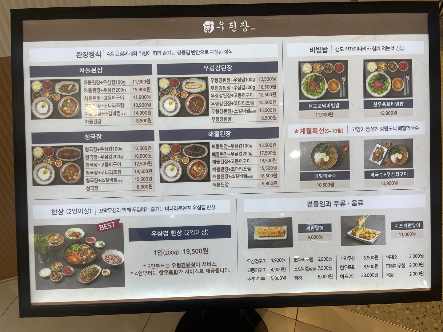 포스팅을 위해 가게 앞에 있는 메뉴판 사진을 찍어보니 생각보다 많은 메뉴 조합이 있었다. 심지어 차돌된장, 해물된장 등 된장찌개도 여러 종류가 있었다. 나는 돈이 없어서였을까 항상 차돌된장+우삼겹 100g 또는 차돌된장+고등어구이만 먹었다. 이날도 차돌된장+고등어구이를 먹었다.