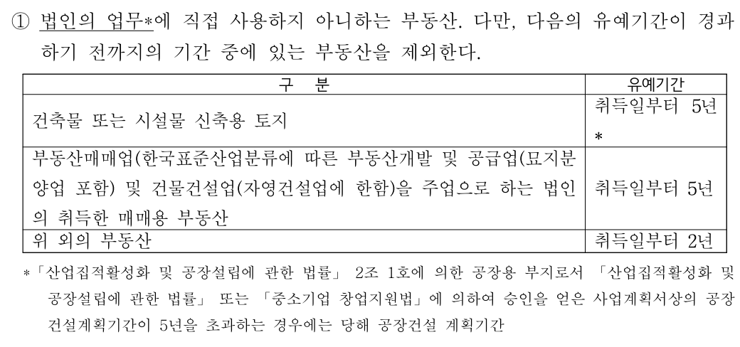 - 법인의 업무에 직접 사용하지 아니하는 부동산 (다만, 유예기간이 경과하기 전까지의 기간 중에 있는 부동산을 제외한다)