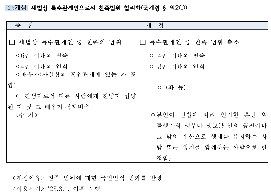세법상 특수관계인으로서 친족범위 합리화(국기령 §1의2①)