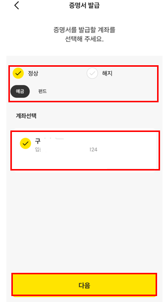 [10] 계좌 예금/펀드와 정상/해지를 선택해준 후
