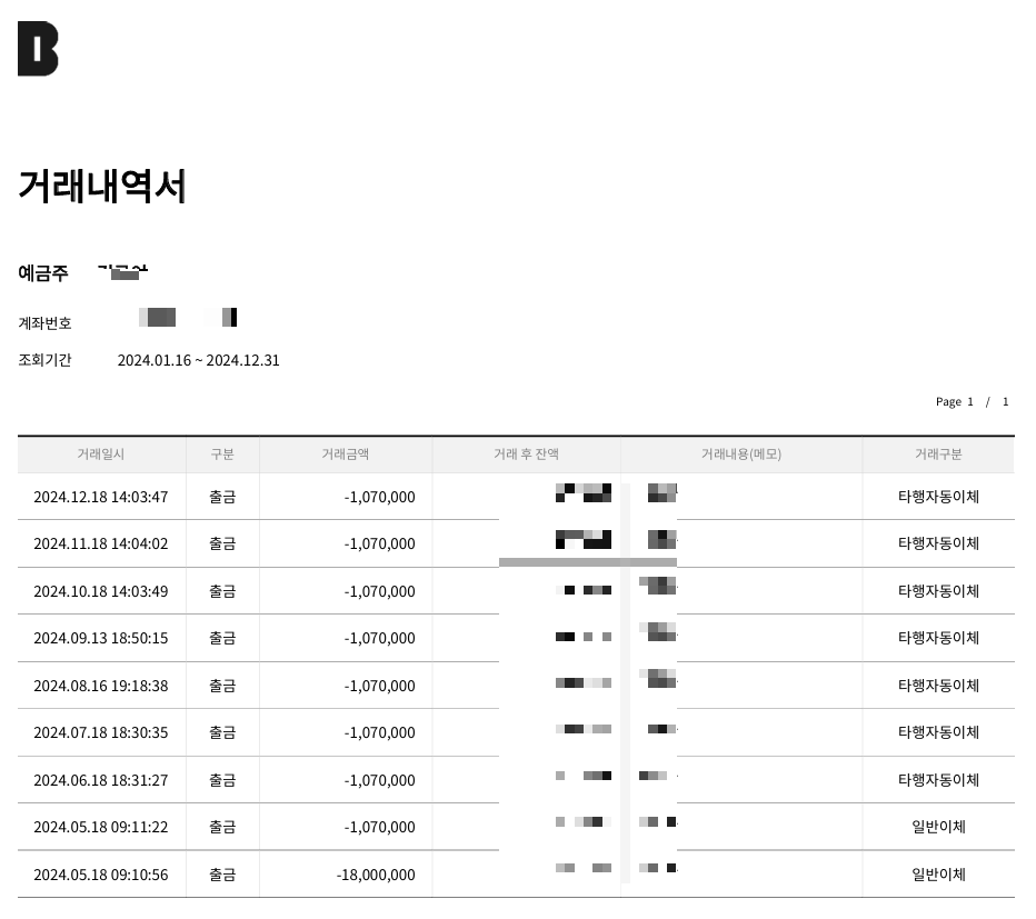 - 거래내역은 1,000건(펀드의 경우 500건) 이하로 출력되며