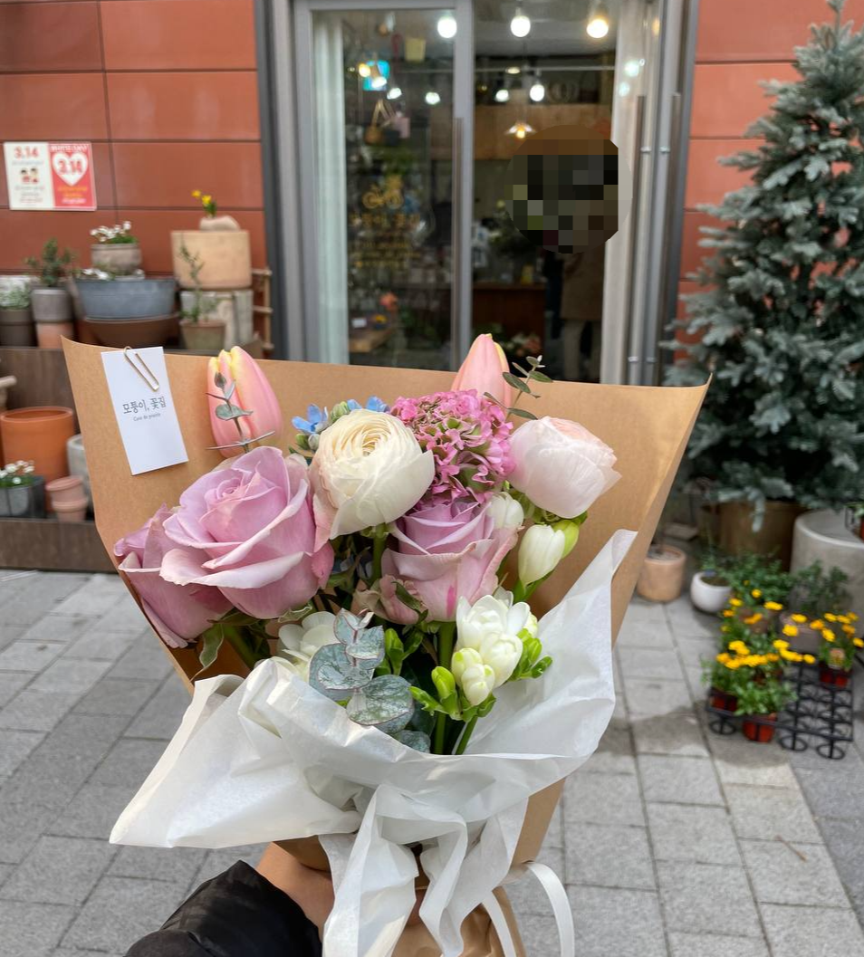 그냥 아무 생각 없이 "예쁘게 만들어주세요"라고 하기만 해도 위의 사진처럼 만들어 주신다. 우리가 간단한 포장만 필요하다고 말씀드렸는데 심플하게 만들어주신 느낌이 저 정도.. 웨딩부케처럼 예쁘게 만들어 주셨다. 보라색, 분홍색, 흰색 계통으로 맞춰서 크게 장미, 튤립, 프리지어로 조합해 주셨다.