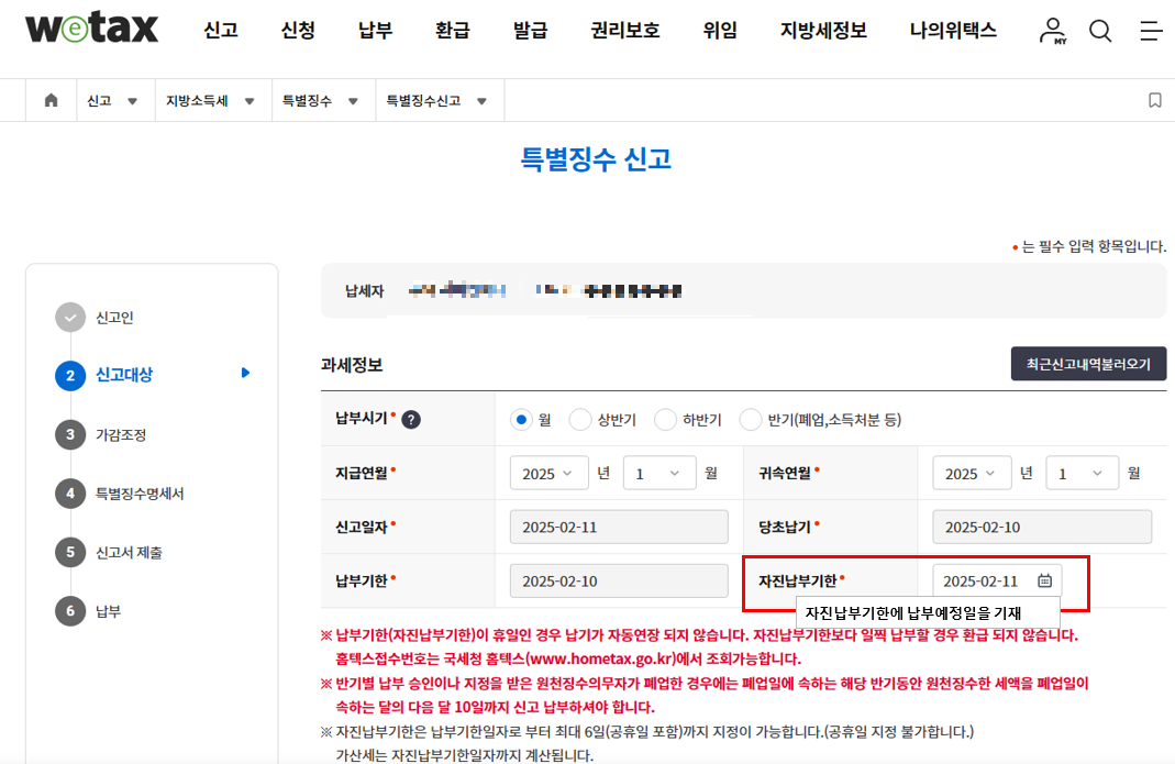 [4] 지급년월과 귀속년월/ 본래 납부기한을 확인한 후 > 자진납부기한(납부예정일)을 기재한다