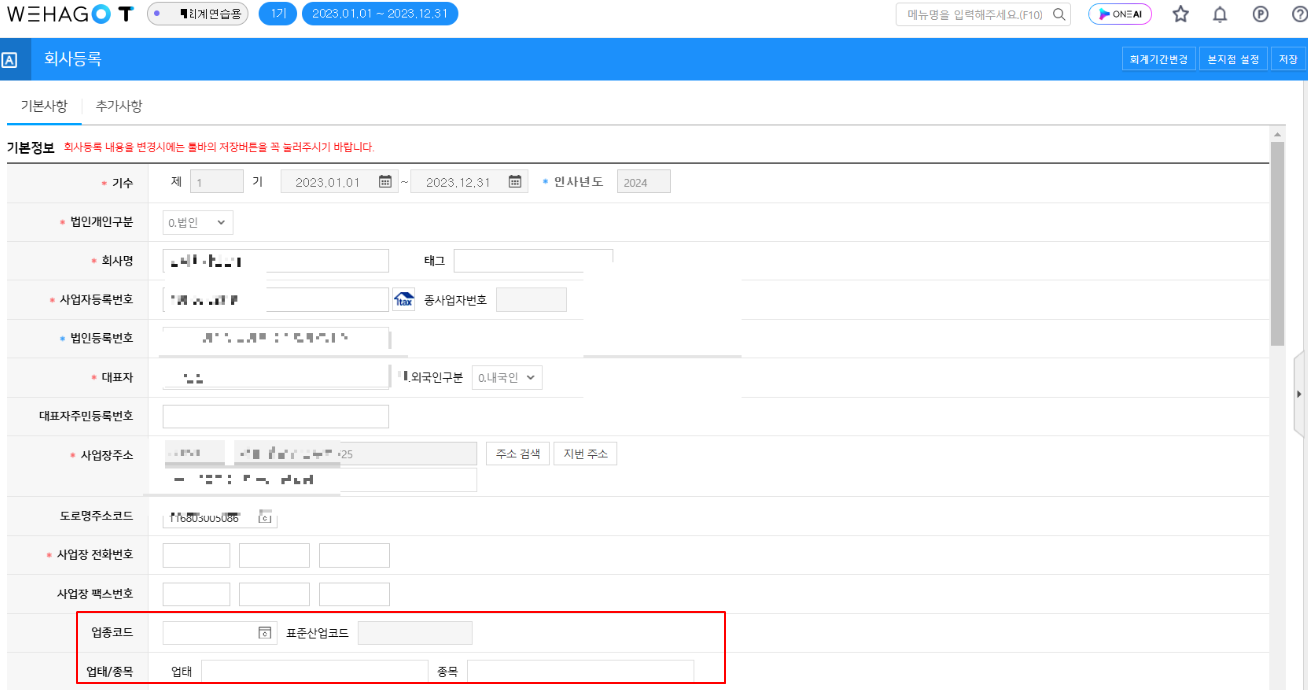 그리고 아래 회사등록에 업종코드와 업태가 잘 입력되었는지 확인하자