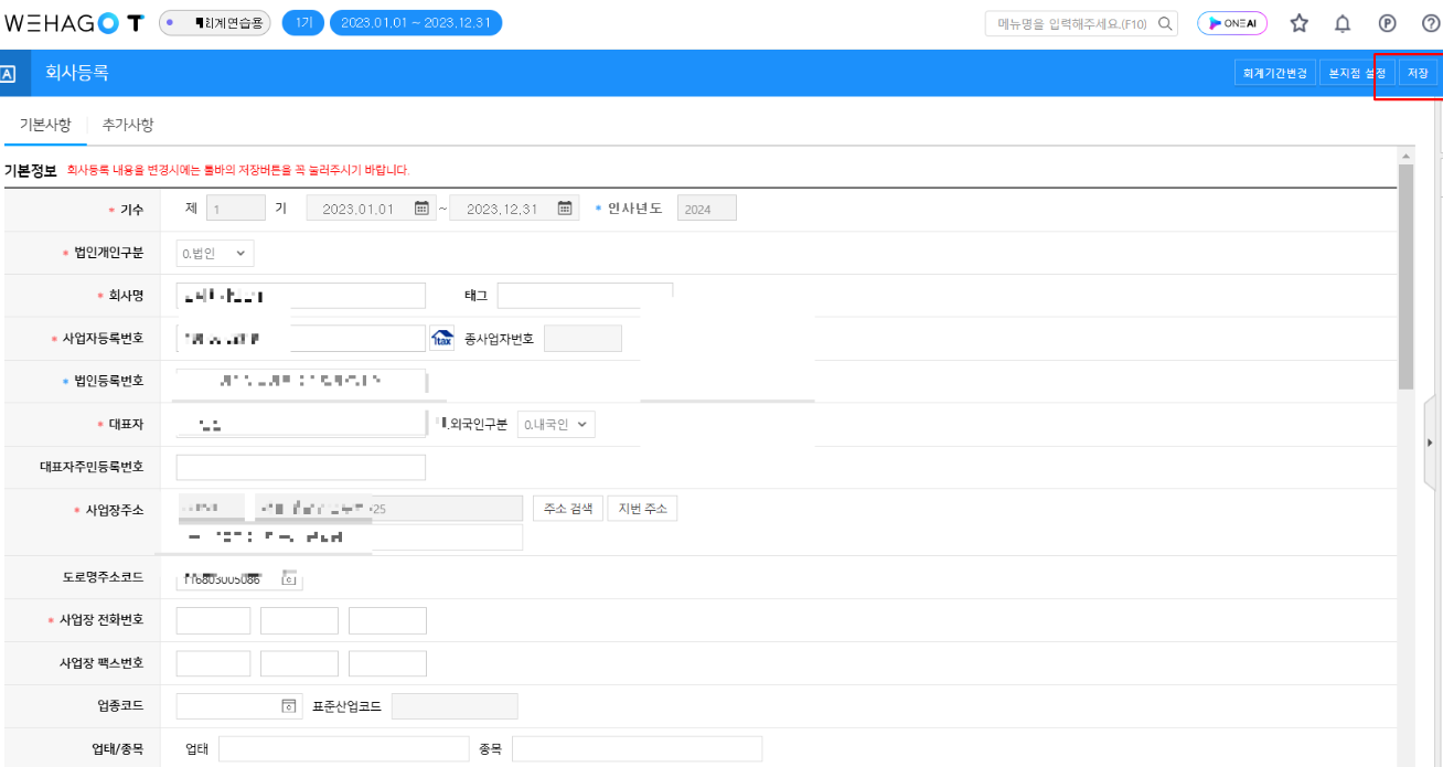 회계> 기초정보관리/데이터관리> 회사등록(회계)에 들어간다