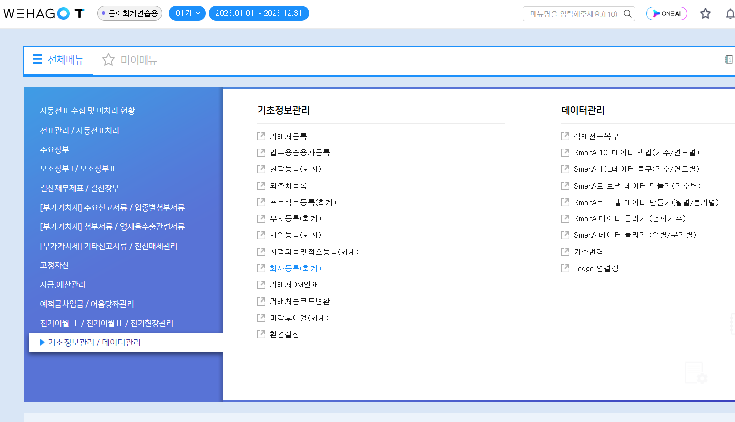 회계> 기초정보관리/데이터관리> 회사등록(회계)에 들어간다