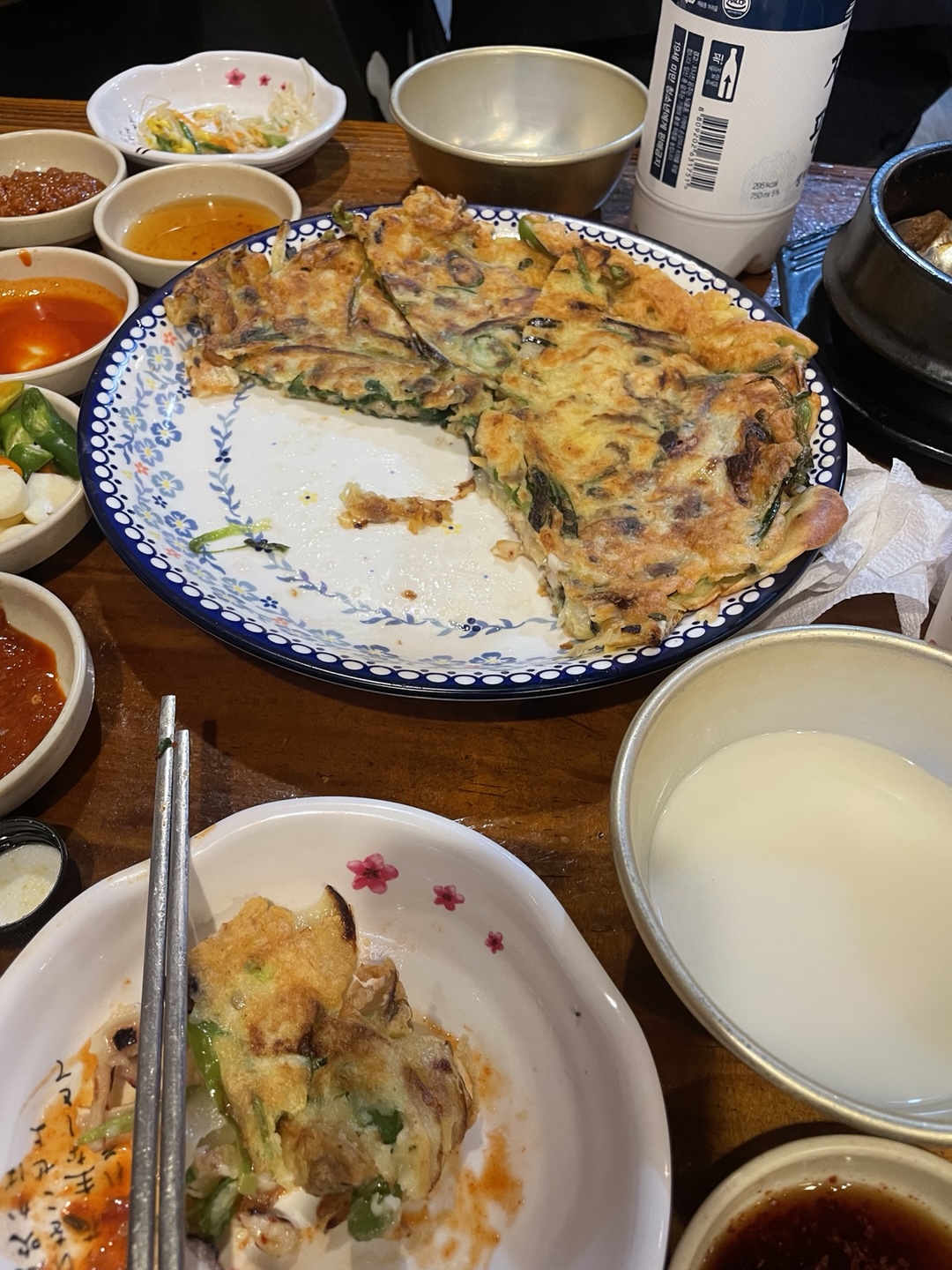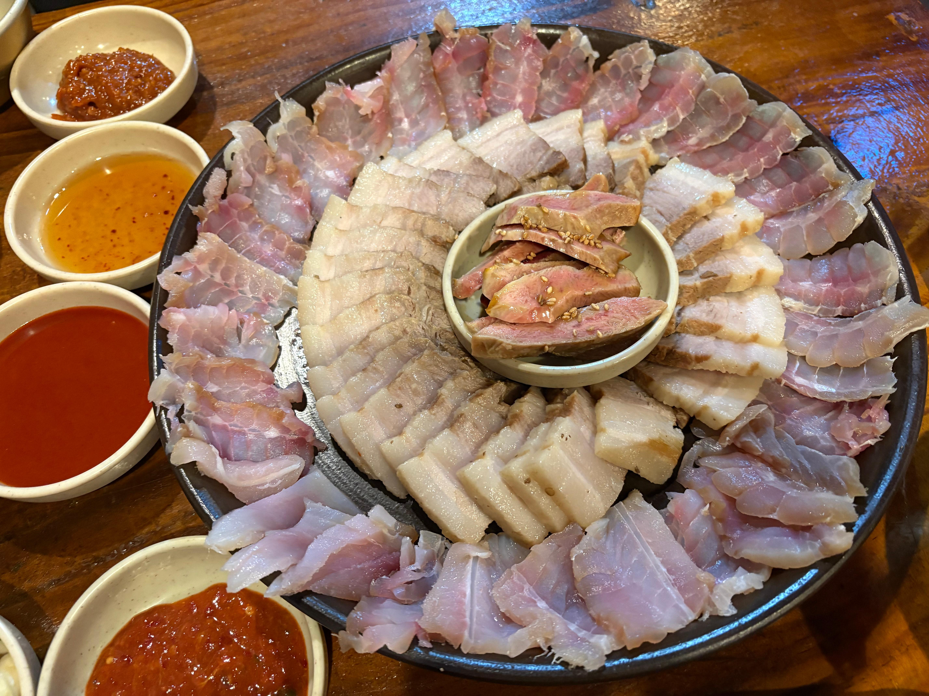 오... 정말 거를 타선 하나 없이 다 맛있었다. 굳이 순위를 매기자면 해물파전이 그냥 그랬지만 홍어 삼합 자체는 정말 맛있었다. 김치와 돼지고기, 홍어를 같이 먹는데 우선 김치가 정말 맛있었다. 사실 홍어를 따로 초장에 찍어먹으면 크게 맛있다는 생각은 들지 않았지만 셋을 같이 먹으면 새로운 맛이 탄생한다.
