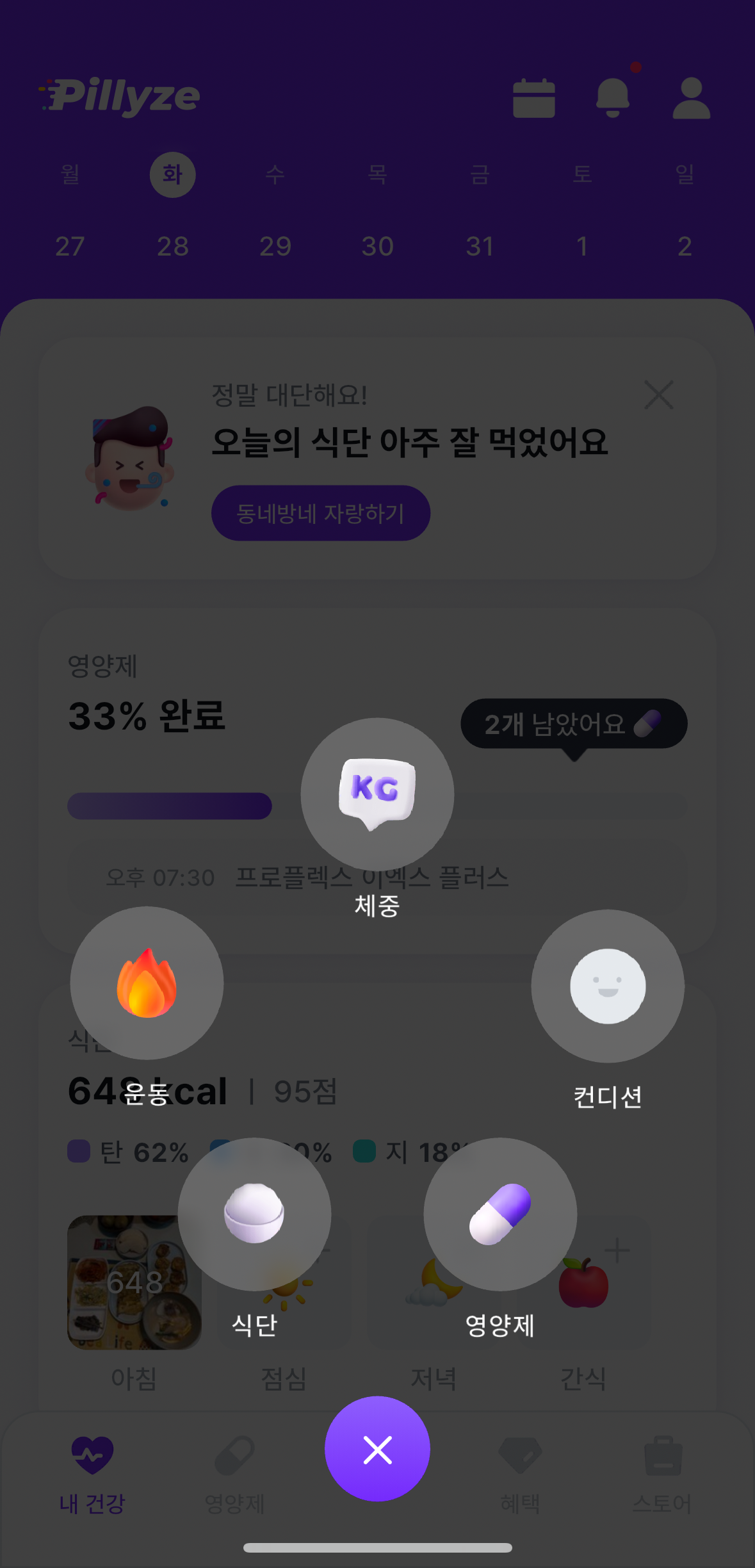 하루 식단, 영양제, 컨디션, 운동, 체중 등을 기록하는 어플인데