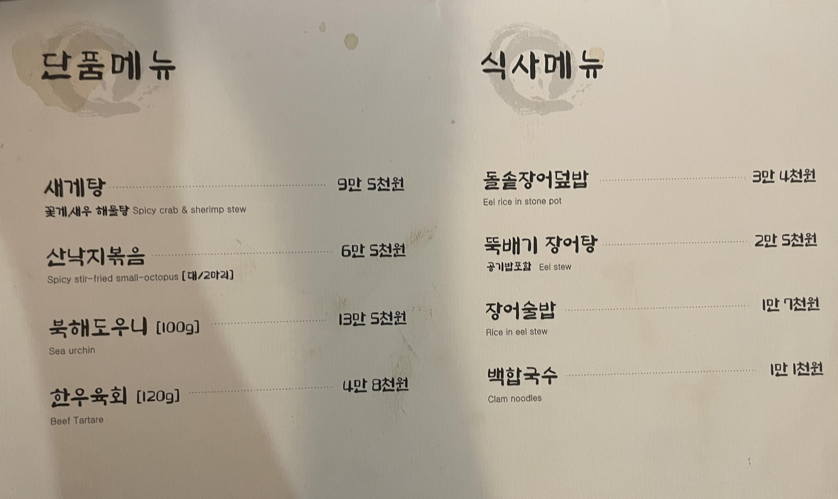 그 외에 독도새우, 우니와 육회, 참치 회, 양념게장 등도 있다.