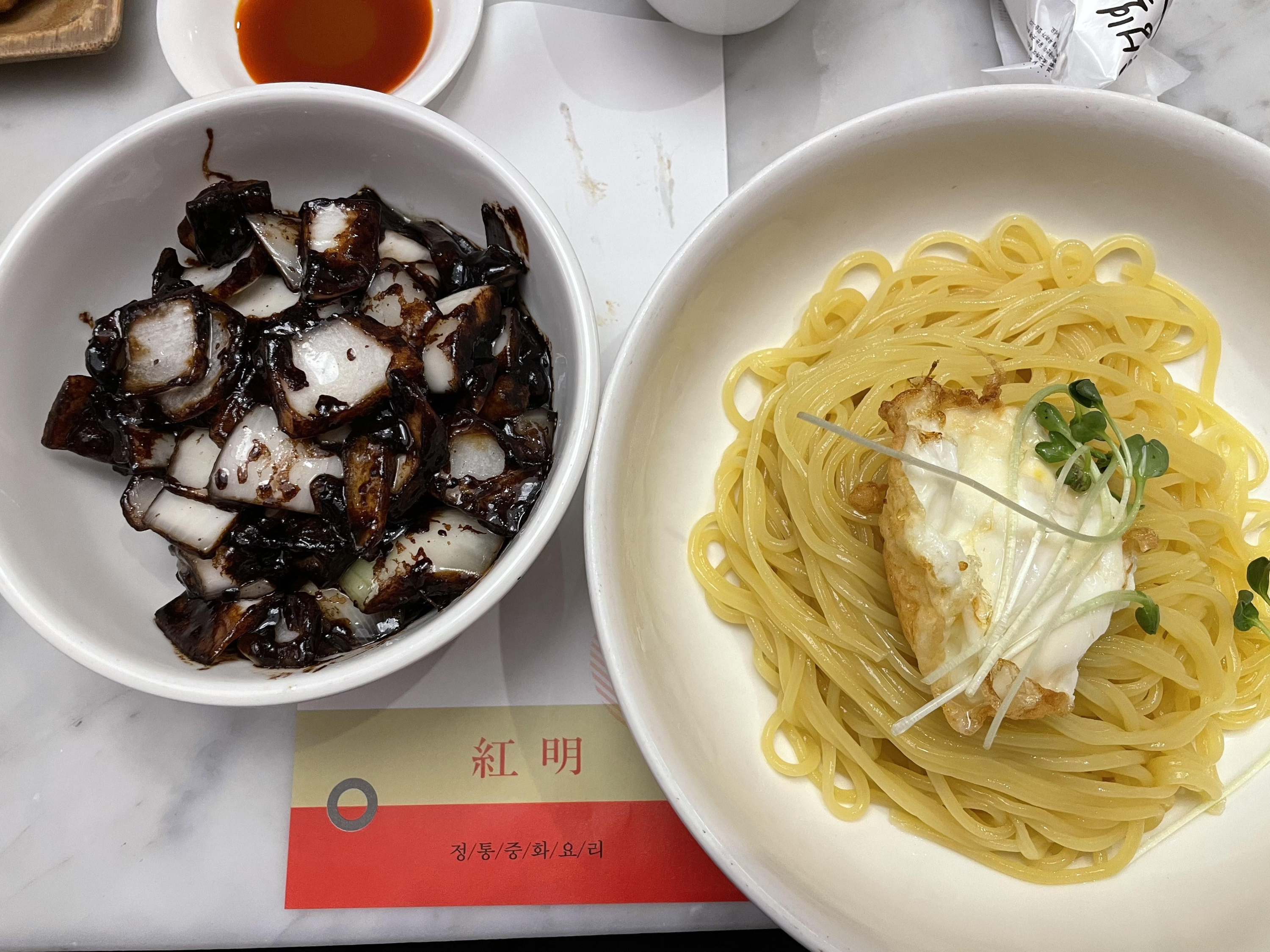 음식점 앞에 특별하게 웨이팅을 위한 공간이 있는 편은 아니여서 줄을 서는 건 어렵지만 음식 나오는 속도는 생각보다 빠른 편이다. 원래 맛집은 물만 마셔도 알 수 있다고 했는데 홍명이 진짜 그런 곳이다. 더운 날 밖에서 기다리다가 내 이름 호명되면 설레는 마음으로 음식점 안에 들어가는데 들어가면 물이랑 짜사이 무침이 상에 놓여있다. 그럼 자연스럽게 물 한 컵부터 들이키게 되는데 물이 너무 맛있다. 그리고 짜사이 무침도 맛있다. 간짜장 기다리면서 짜사이 무침을 다 먹으면 서빙하시는 분들이 상을 한 번씩 보시고 채워주신다.