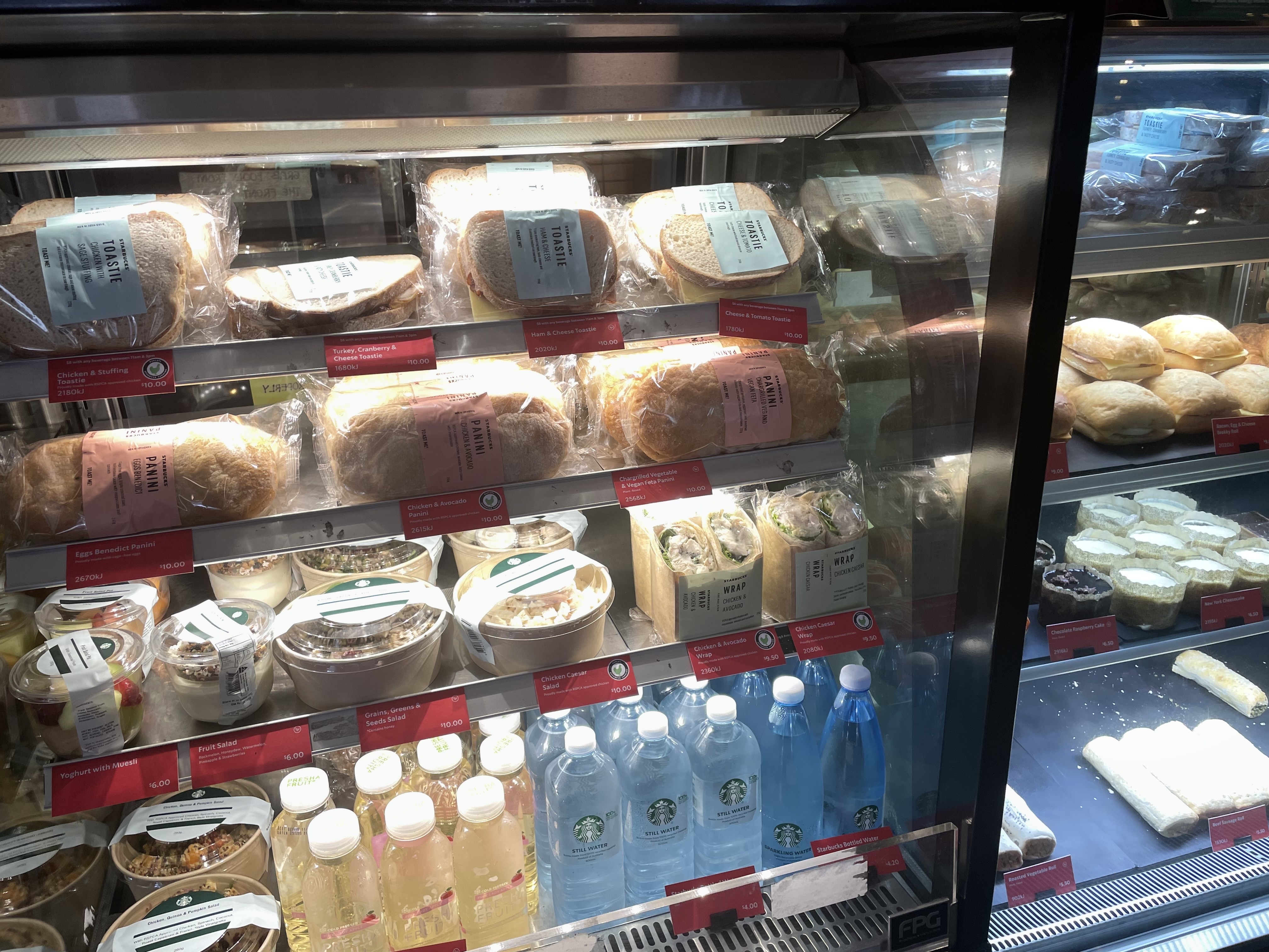 샐러드, 랩, 파니니, 토스트, 베이글, 크루아상 등을 팔고 있었다.