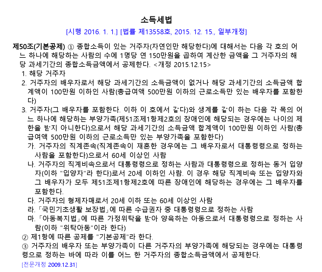 기본공제의 정의는 소득세법 제 50조에 자세하게 나와있다.